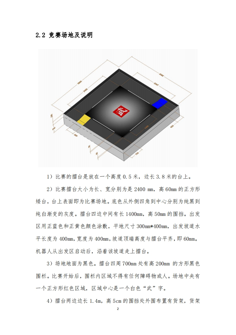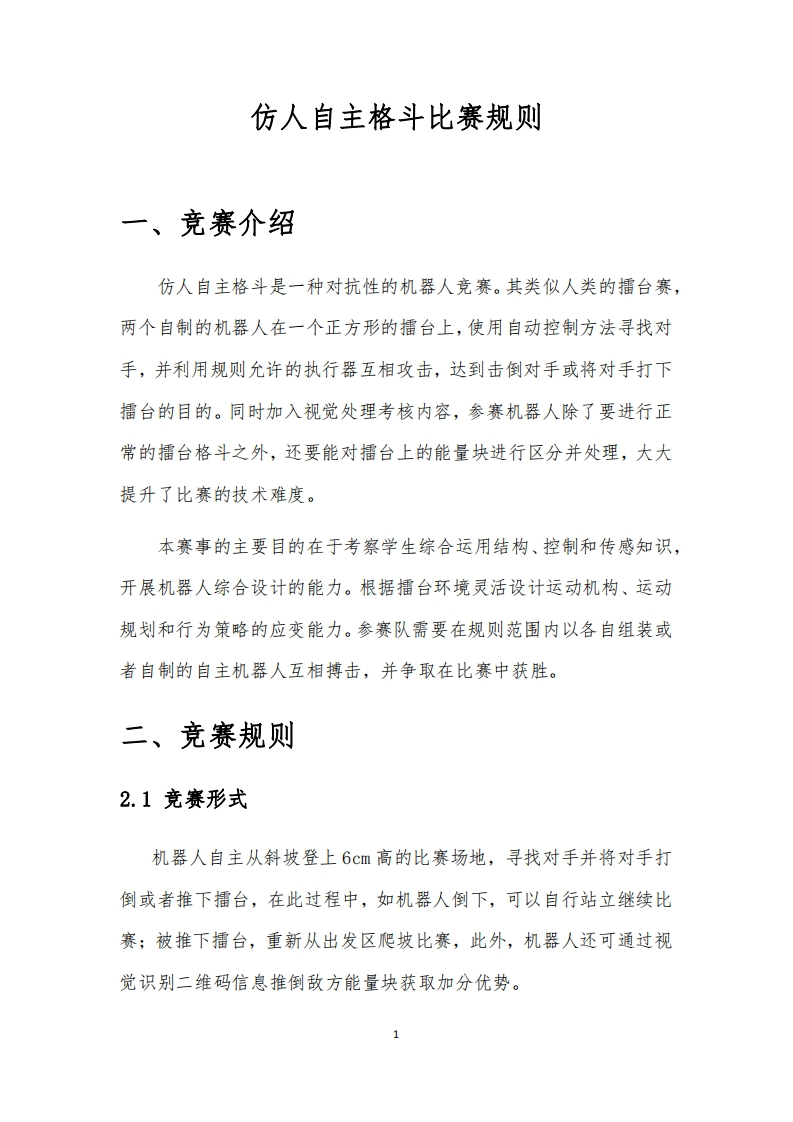 仿人自主格斗比赛规则一、竞赛介绍仿人自主格斗是一种对抗性的机器人竞赛。其类似人类的擂台赛,两个自制的机器人在一个正方形的擂台上,使用自动控制方法寻找对手,并利用规则允许的执行器互相攻击,达到击倒对手或将对手打下擂台的目的。同时加入视觉处理考核内容,参赛机器人除了要进行正常的擂台格斗之外,还要能对擂台上的能量块进行区分并处理,大大提升了比赛的技术难度。本赛事的主要目的在于考察学生综合运用结构、控制和传感知识,开展机器人综合设计的能力。根据擂台环境灵活设计运动机构、运动规划和行为策略的应变能力。参赛队需要在规则范围内以各自组装或者自制的自主机器人互相搏击,并争取在比赛中获胜。二、竞赛规则2.1竞赛形式机器人自主从斜坡登上6Cm高的比赛场地,寻找对手并将对手打倒或者推下擂台,在此过程中,如机器人倒下,可以自行站立继续比赛;被推下擂台,重新从出发区爬坡比赛,此外,机器人还可通过视觉识别二维码信息推倒敌方能量块获取加分优势。