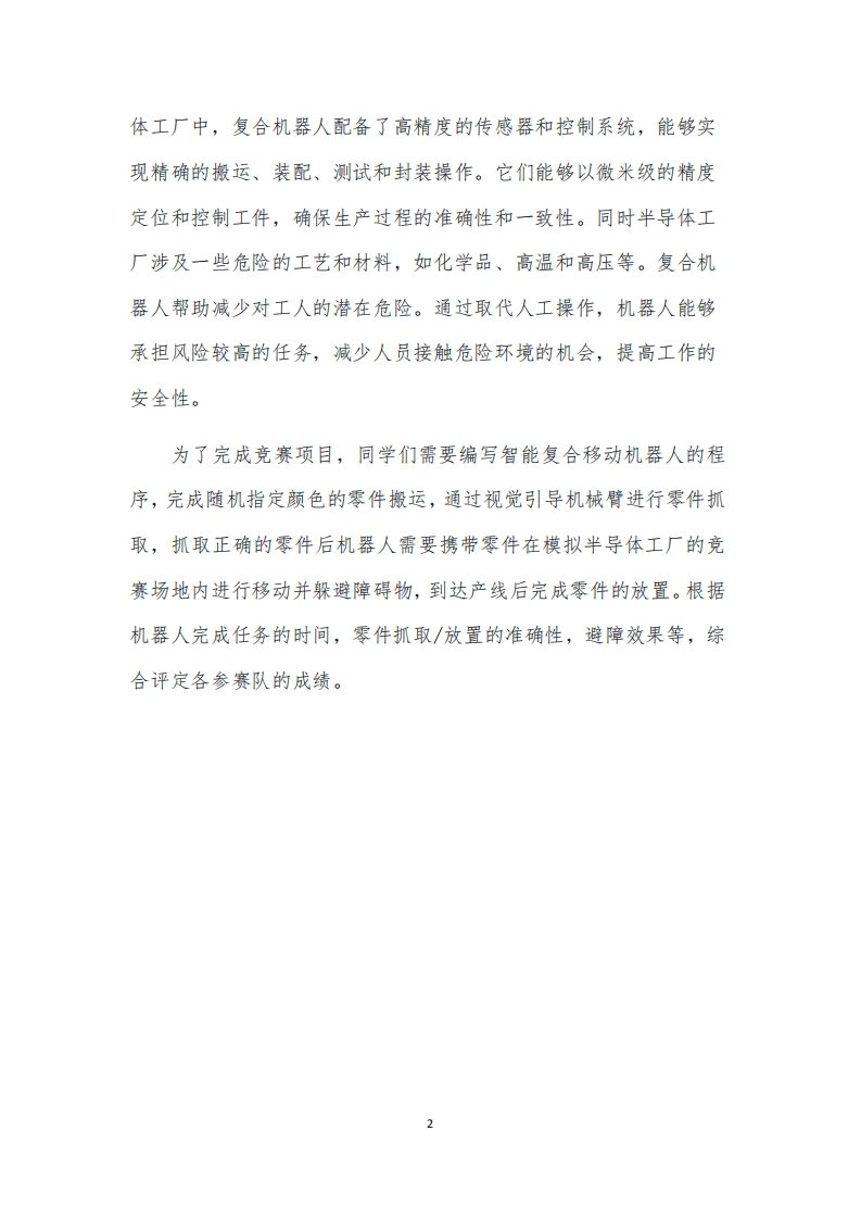 服务机器人搬运竞技比赛规则一、竞赛介绍服务机器人搬运竞技比赛项目模拟未来的智能生产车间,智能机器人根据需求完成物料运输任务。本项比赛参赛机器人需要在规定时间内快速准确的完成货物运输任务,需要机器人自主的判别自身位置、有效的避障、任务目标识别、机械臂运动规划等。ROS的开发语言独立,支持C+,python等多种开发语言还聚合了全世界开发者实现的大量开源功能包,具有优良的开源基因,松耦合设计方法,可扩展的软件结构,功能复用思想,极大降低了机器人领域的进入门槛,让开发者无需像前人一样走过众多弯路,掌握多种知识后才能开始实现其机器人设计的梦想。该赛事的主要目的在于促进智能机器人技术的发展。参赛队伍通过本项赛事,可以直接快速的了解和入门智能机器人的开发;在参赛过程中,可以有效的培养学生的综合工程能力、创新能力、团队协作能力。二、竞赛规则2.1竞赛形式本赛项是模拟半导体工厂里复合机器人运输配送的赛项,半导