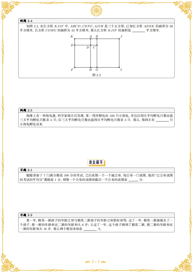 始助元(小争中年舰血)www.omaths.com擦究哥习例斯2.1雅典图书馆的大厅里存放着一套由10块独立沙发组成的“组合式沙发凳”.一次旅游,聪明的小鱼看到这套“组合式沙发凳”后,觉得很漂亮,于是把这10块沙发所组成的图形画了下来(如图2.1).其中4、5、6、8号都是等边三角形,边长都是2厘米:1、4、5、8、10号,2、5、6、8、9号和3、4、5、6、7号所组成的3个长方形完全一样,长都是6厘米.小鱼想把这个图形沿线剪成10块纸片,并将这10块纸片无重叠地拼成一个大长方形如果拼好后的大长方形的宽与原来1个长方形的宽相等,那么,拼好后的大长方形的长是厘米(纸片可翻转)。图2.1例题2.2两只兔子种了1行萝卜.有一天它们去拔萝卜,小白的想法是先拔出某一根,然后朝两边每隔6根拔一根,直到不能再拔;小灰的想法则是先拔去某一根,然后朝两边每隔8根拔一根,也直到不能再拔.如果它们可能得到的萝卜数量是一样的,那么这行萝卜最多有根例题2.310个小朋友围成一个圈,他们每人想好一个数,然后将想好的数告诉相邻的两个人,然后每个人将自己知道的三个数的平均数写在了纸上,老师发现纸上写的数从某个开始,顺时针依次是10个连续的两位数.那么,这10个小朋友开始想的数中,最大的比最小的多n第1页00