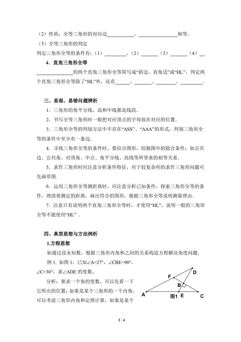 全等三角形复习指导一、复习目标1.理解三角形的有关概念,以及三角形三边之间的关系、内角和等基本性质,2.掌握一般三角形全等和直角三角形全等的条件,能熟练利用判别方法说明两个三角形全等.3.掌握用尺规作三角形的基本方法,会利用尺规根据三角形全等的识别方法作三角形4.能借助三角形有关知识解决实际生活中的问题.二、重要知识点回顾(请你仔细阅读并填空)1.三角形有关概念(1)定义:叫三角形.(2)边角关系:三角形两边之和三角形两边之差:三角形三个内角的和是(3)分类:三角形按角分类为三角形、三角形、三角形:直角三角形两锐角(4)重要线段:叫做三角形的角平分线,叫做三角形的中线,叫做三角形的高,三角形的三条角平分线交于、三条中线、三条高所在的直线2.图形全等(1)定义:称为全等图形,(2)特征:全等图形的都相同.3.全等三角形(1)定义:叫全等三角形:如果△ABC与△DEF全等,把它们记作,记两个三角形全等时,一般把写在对应的位置上1/4