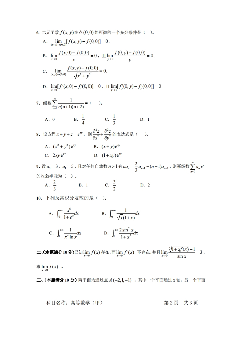 中国科学院大学2020年招收攻读硕士学位研究生入学统一考试试题科目名称:高等数学(甲)考生须知:1.本试卷满分为150分,全部考试时间总计180分钟。2.所有答案必须写在答题纸上,写在试题纸上或草稿纸上一律无效。一、选择题(本题满分50分,每小题5分。请从题目所列的选项中选择一个正确项填充空格。每题的四个备选项中只有一个是正确的,不选、错选或多选均不得分。请将你的选择标清题号写在考场发的答题纸上,直接填写在试题上无效。)241.极限1im2n十*十的值为(。n2+1n2+n-A.0B.1C.2D.+02.设f(x)在x=a处连续,F(x)=f(x)川x-a,则f(a)=0是F(x)在x=a处可导的()A.充要条件B.充分非必要条件C.必要非充分条件D.既非充分又非必要条件1lim(sin x)sinx3.极限的值为A.e-lB.1C.eD.+04.设周期函数f)在(-0,+o)内可导,周期为4,又织-”=-1,则曲线y=f)2x在点(5,f(5)处的切线斜率为()。A.B.2C.-1D.-25.设向量ā=(L,2,2),b=(0,1,2),则向量b在向量a方向上的投影向量为)。A.科目名称:高等数学(甲)第1页共3页