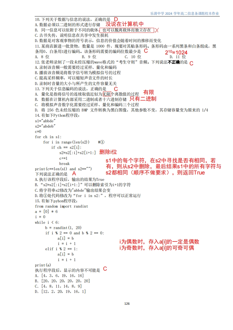 1-5CCBBC 6-10DBABD 11-15CCCAC 16-20DABDA 21-22CC23.①len(man)>1或1en(out)<9乐清中学2024学年高二信息备课组校本作业②(pos+m-1)%len(man)高二上信息技术基础练习4阅读下列材料,回答第1至3题.某玩家和计算机进行石头剪刀布游戏,规则为剪刀胜布,石头胜剪刀,布胜石头,相同则平局,胜局多者赢。用g表示玩家,c表示计算机,数字0表示石头,1表示剪刀,2表示布。1.实现判断单局结果的部分程序段如下,下列选项不正确的是CB.c.D.if(g+1)%3=c:if(g+1)%3=c:if(g+1)%3=c:f(g+1)%3=c:print("玩家获胜“)print(“玩家获胜")print("玩家获胜“)print(“玩家获胜“)elif (g 2)%3 ==c:else:if(g+2)%3==c:if(g+2)%3=℃:print(计算机获胜“)if(gr2)%3==c:print(“计算机获胜“)print(计算机获胜“)else:print("计算机获胜")lse:if g ==c:print(“平局)else:print("平局")print("平局")print("平局")2.下列能判断玩家单局获胜的表达式是CA.gm:m=bfor i in [a,b,c]if b>a:m-belif am:m=cm-iif c>a:m=aelse:a=cm=areturn a出的n-find m(a,b,c)5.下列关于大数据的说法,正确的是CA.大数据指数据量庞大、产生速度快、价值密度高的数据B.处理大数据强调对事物因果关系的探求C.一般采用分治思想处理大数据D.道路交通大数据仅采用批处理方法6.下列关于人工智能的说法,正确的是DA.人脸识别不需要对大量图像进行挖掘和学习B.在与环境交互中不断学习的扫地机器人属于符号主义C.人工智能技术不会威胁人类安全D.协同医生完成手术的机器人是混合增强智能的应用阅读下列材料,回答第7至8题。小明以二十四节气文化为主题用计算机设计文创作品,以明信片形式分享给好友。其中大署节气作品部分截图如图所示。7.下列关于数字化与编码的说法,正确的是BA.该图像中的字符以ASCII码形式存储00口000B.不同格式的图像文件编码方式一般不同C.扫描图像中的二维码是编码的过程D.打印明信片是数字化的过程8.下列关于数据与信息的说法,正确的是AA.图像中的二维码是数据的一种表现形式B.二十四节气对于不同的人价值相同C.图像在计算机中可采用十六进制存储D.明信片只能以纸质形式进行分享9.下列有关信息、数据的说法正确的是BA.信息具有载体依附性,我们阅读时看到的文字就是信息数据B.信息往往会随着时间的推移而变化C.文本数据在计算机中都以十六进制的形式存储二进制D.数据的表现形式是单一的,只能是数字125