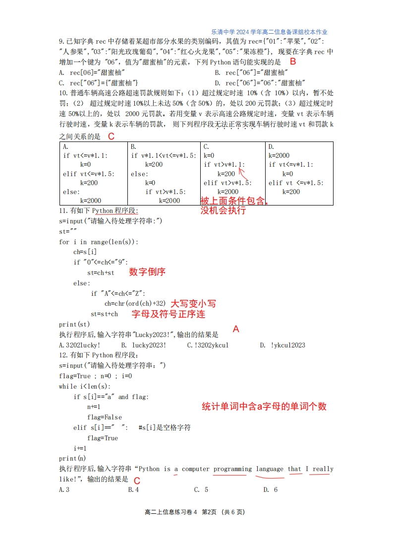 乐清中学2024学年高二信息备课组校本作业乐清中学2024级高二上信息练习卷4(十一作业)一、选择题1.关于数据与信息的说法,正确的是CA.数据就是指数字数字是数据的其中一种表达方式B.信息会随着载体形式的变化而变化信息不变,载体变化C.计算机对各类信息进行加工处理,本质上都是通过计算完成的D.信息的价值是通过数据的加工处理而获得的没有加工处理,信息也可以有价值阅读下列材料,回答2-3题:大数据、人工智能的迅猛发展和普及,为杭州亚运会的筹备加入了许多数智化创新的元素。例如电竞中心运用全感知的5G数字基座,接入了设备数量超万台、数据类型达10万种以上的“数字驾驶舱”,可以实现场馆平时与赛时相结合的智能化管理,也可借助人行、车行设备系统实现对车辆数据、通行数据、检票数据的流量分析及预警。2.下列关于大数据,说法正确的是CA.5G数字基座内的数据产生速度极快,但是处理速度较慢处理速度也快B.数字驾驶舱内的数据,都是机器产生的还有人产生的C.电竞中心采集的数据量庞大,但可能发挥价值的仅是其中非常小的一部分价值密度低D.对通行、检票数据等进行流量分析及预警时要追求数据的精确性只追求相关性,不追求精确性3.下列关于数据安全的说法,正确的是BA.在使用“数字驾驶舱”数据时,不需要考虑数据的安全性B.通过对检票数据进行加密、校验等方法有助于提高数据的安全性传统数据库管理技术无法C.对“数字驾驶舱”中的数据进行管理时,可以采用传统的数据库管理技术满足大数据管理的需要D.增强数据安全,重点应该提高数据本身的安全,存储数据介质的安全不太重要介质安全一样重要,4.使用UltraEdit软件观察字符,下列说法正确的是D磁盘阵列、异地容灾0123456789ah9d900000000h:32303233D1C7D4 CB BB E1474FA3A1;2023亚运会c01A.字符“!”的内码占一个字节←B.字符“J”的十六进制内码为504AC.字符“10”的十六进制内码为3A3130D.图中共有6个ASCII编码,4个汉字编码5.若将十进制数n转换成二进制数y,该二进制数y的末位是1,下列说法不正确的是BA.可以确定该十进制数n为奇数B.将该二进制数末位的1去掉后,再转换为十进制数,所得的值是n/2/2C.该十进制数n+1转换成二进制数,二进制位数可能比y多D.若该二进制数末位后加上数码0,则新数是原数的2倍4003001685306.一个时长为5秒、400*300像素,16位色的未经压缩NTSC制式(30帧/秒)的AVI格式1200*1024-25*30无声视频文件,压缩为MP4格式后的大小为1200KB,则其压缩比为AC:60:1开始10A.30:1B.48:1D:120:1=30:17.某算法流程图如图所示,若输入k的值为5,以下说法正确的是Ds=0,i=1,te1A.程序运行结束后,s的值是2S=1-2+3-4=-2B.循环体共执行了5次4次输入kC.程序结束后,t的值为-11ND.表达式i8.下列表达式的结果为True的是D5Ys=s+it输出5A.not"a”in"appleB.2023%1000//4=23i+=1C."t"in ["tomato","bear","banana"]D."abc"*2>="abca"t=-t结束"t"in ["t","tomato","bear","banana"]True第7题图高二上信息练习卷4第1页(共6页)