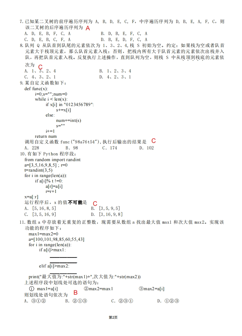 乐清中学2023级高二下信息学科周练5一、选择题(本大题共12小题,每小题2分,共24分。每小题列出的四个选项中只有一个是符合题目要求的,不选、错选、多选均不得分。)阅读材料,回答第1至3题:某市部署了“智慧交通管理系统”,通过道路摄像头实时采集车流数据,结合地磁传感器检测车辆位置,数据经5G网络传输至交通控制中心。系统利用深度学习模型预测拥堵趋势,动态调整信号灯时长;市民通过手机APP查询实时路况,并接收绕行建议。应急车辆(如救护车)可通过车载终端优先申请绿灯通行,道路摄像头通过车牌识别验证身份,系统自动协调周边信号灯。所有数据加密存储于市政云服务器,并与交警数据库联动。1.下列选项中关于该系统的说法,错误的是DA.地磁传感器采集的车辆位置数据,需处理后才能用于拥堵分析B.该系统中的文字、图片、视频等是数据的表现形式C.深度学习模型的预测结果可能因数据更新而变化应急车辆通过车载终端申请,也是数据输入D.系统仅通过摄像头和地磁传感器两种方式获取数据2.若系统频繁误判应急车辆,导致信号灯混乱,下列改进方案中不合理的是DA.提高道路摄像头的分辨率以提升图像清晰度B.优化车辆身份识别算法与权限验证机制C.定期更新数据,适应新型应急车辆特征D.在系统中关闭应急车辆优先功能,改为人工远程控制信号灯3.根据阅读材料,下列关于大数据的说法,不正确的是AA.道路摄像头实时采集的车流数据,处理时使用批处理计算B.该市每天产生的交通数据量非常庞大,可以使用大数据技术进行处理C.大数据会带来信息泄露、数据安全、个人隐私保护等方面的社会问题D.大数据具有数据规模大、速度快、类型多、价值密度低四个特征4.健康成年人的心率一般是60~100次/分。用Python语言编写程序代码,t表示输入的心率,程序运行结束后,若flag为True,则表示心率正常,若flag为False,则表示心率异常。下列语句不能正确表示心率情况的是CA.flag-FalseB.flag-Trueif>100D.ift长60:if>=60:if t<60:flag-Falseflag=Falseflag=Trueflag=Falseif>=60:包含>100 elift<=100:if>100:elift>100:flag=Trueflag=Trueflag=Falseflag-Falseelse:else:flag=Falseflag=False5.有一段时长30秒、采样频率44.1Kz、未经压缩的双声道Wave音频文件,该音频文件的存储容量约为10MB,则其量化位数约为C10*1024*1024*8A.8位B.16位C.32位D.64位开始44100*2*306.某算法的流程图如第6题图,以下说法正确的是D第6题图k-0t-2A.程序运行结束后,k的值是奇数B.循环体共进行了5次C.程序结束后,t的值一定大于10