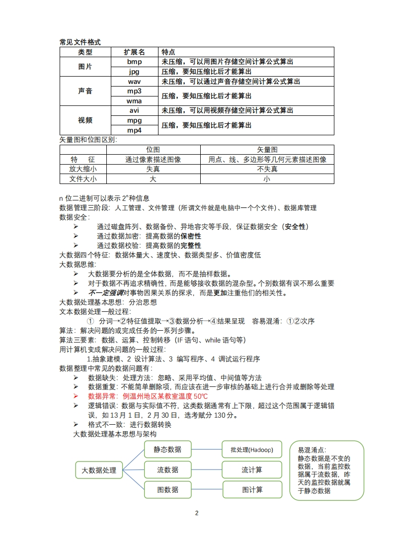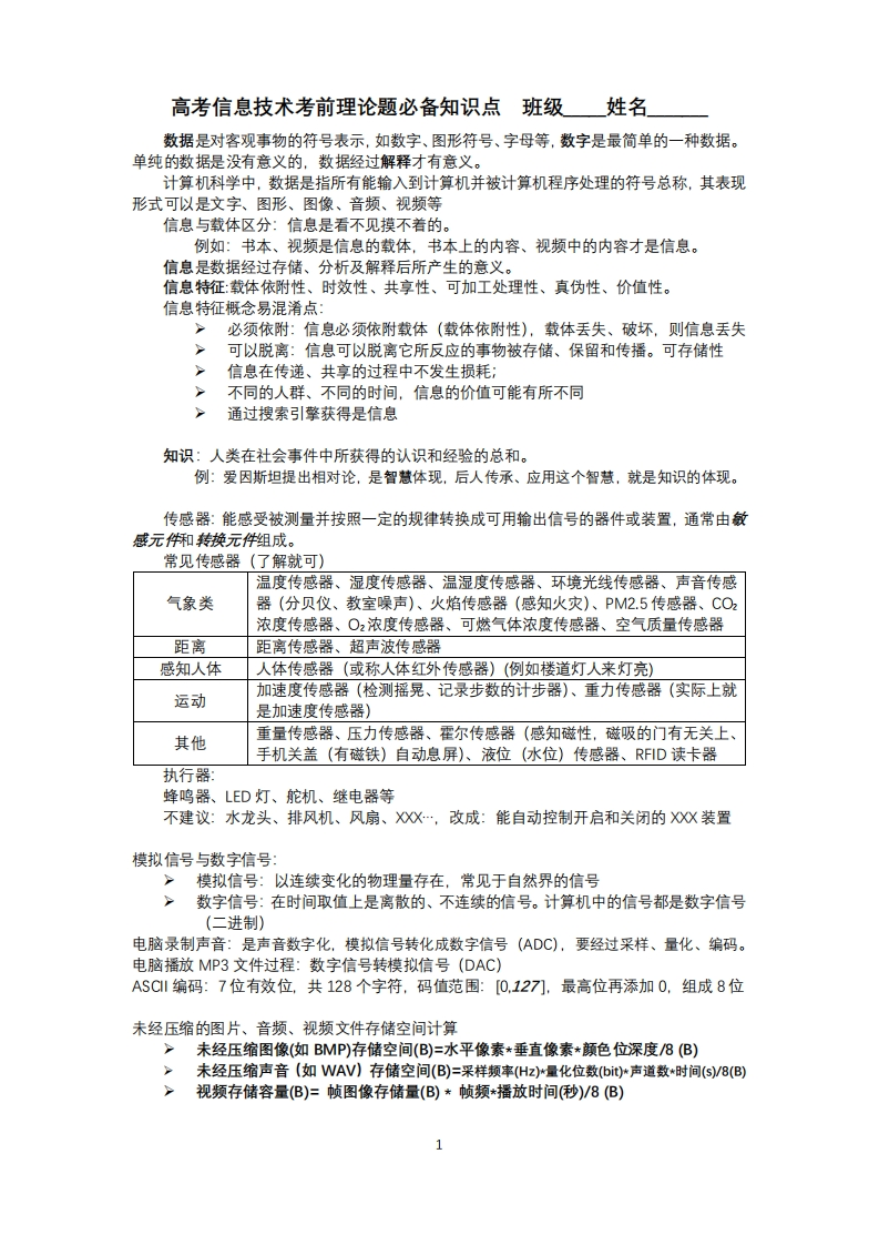 高考信息技术考前理论题必备知识点班级姓名数据是对客观事物的符号表示,如数字、图形符号、宇母等,数字是最简单的一种数据。单纯的数据是没有意义的,数据经过解释才有意义。计算机科学中,数据是指所有能输入到计算机并被计算机程序处理的符号总称,其表现形式可以是文字、图形、图像、音频、视频等信息与载体区分:信息是看不见摸不着的。例如:书本、视频是信息的载体,书本上的内容、视频中的内容才是信息。信息是数据经过存储、分析及解释后所产生的意义。信息特征:载体依附性、时效性、共享性、可加工处理性、真伪性、价值性。信息特征概念易混淆点:必须依附:信息必须依附载体(载体依附性),载体丢失、破坏,则信息丢失可以脱离:信息可以脱离它所反应的事物被存储、保留和传播。可存储性信息在传递、共享的过程中不发生损耗:不同的人群、不同的时间,信息的价值可能有所不同通过搜索引擎获得是信息知识:人类在社会事件中所获得的认识和经验的总和。例:爱因斯坦提出相对论,是智慧体现,后人传承、应用这个智慧,就是知识的体现。传感器:能感受被测量并按照一定的规律转换成可用输出信号的器件或装置,通常由敏感元和转换元件组成。常见传感器(了解就可)温度传感器、湿度传感器、温湿度传感器、环境光线传感器、声音传感气象类器(分贝仪、教室噪声)、火焰传感器(感知火灾)、PM2.5传感器、CO2浓度传感器、○,浓度传感器、可燃气体浓度传感器、空气质量传感器距离距离传感器、超声波传感器感知人体人体传感器(或称人体红外传感器)(例如楼道灯人来灯亮)加速度传感器(检测摇晃、记录步数的计步器)、重力传感器(实际上就运动是加速度传感器)其他重量传感器、压力传感器、霍尔传感器(感知磁性,磁吸的门有无关上、手机关盖(有磁铁)自动息屏)、液位(水位)传感器、RFD读卡器执行器蜂鸣器、LED灯、舵机、继电器等不建议:水龙头、排风机、风扇、X,改成:能自动控制开启和关闭的X装置模拟信号与数字信号:>模拟信号:以连续变化的物理量存在,常见于自然界的信号>数字信号:在时间取值上是离散的、不连续的信号。计算机中的信号都是数字信号(二进制)电脑录制声音:是声音数字化,模拟信号转化成数字信号(ADC),要经过采样、量化、编码。电脑播放MP3文件过程:数字信号转模拟信号(DAC)ASC1编码:7位有效位,共128个字符,码值范围:[0,127].最高位再添加0,组成8位未经压缩的图片、音频、视频文件存储空间计算>未经压缩图像(如BMP)存储空间(B)=水平像素*垂直像素*颜色位深度/8(B)未经压缩声音(如WAV)存储空间(B)=采样频率(Hz)*量化位数(bit)*声道数*时间(S)/8(B)视频存储容量(B)=帧图像存储量(B)*帧频*播放时间(秒)/8(B)1