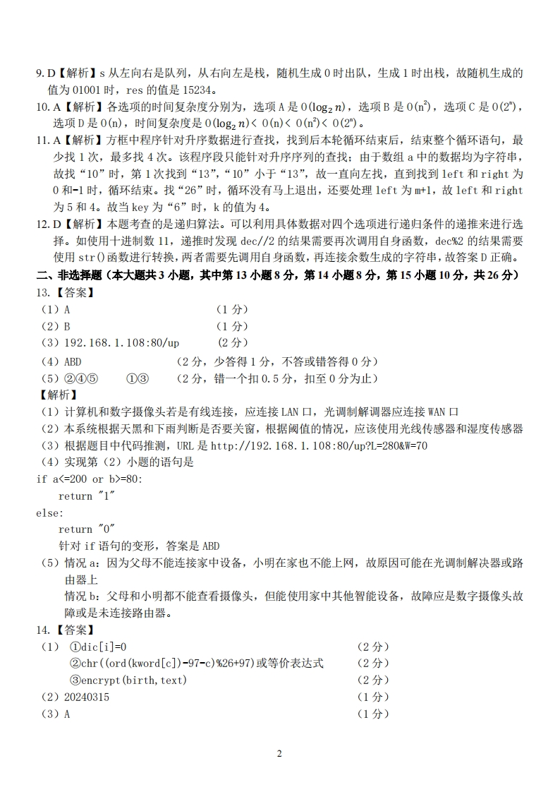 高三上信息技术:综合练习卷一参考答案及解析一、选择题(本大题共12小题,每小题2分,共24分。每小题列出的四个备选项中只有一个是符合题目要求的,不选、多选、错选均不得分)题号1245689101112答案BABDDCCBDAAD1.B【解析】信息可以用模拟信号和数字信号表达,故A错误:信息对不同的人产生的价值不相同,故C错误;传统数据库技术擅长处理结构化数据,故D错误2.A【解析】机器人技术和日益成熟,使成本低于人工,故可能在从事高度重复或按部就班的工作的人员将逐步被机器人取代,故A正确,B错误:生成式人工智能由于数据集的偏差,可能会产生错误的答案,不一定很准确,故C错误;人工智能换脸,在交友时并不安全,故D错误。3.B【解析】声音数字化过程时,增加量化位数才可提高量化精度,在计算机内部编码均采用二进制,生成二维码是一个编码的过程,故B正确。4.D【解析】计算机的主要硬件组成部分由运算器、控制器、存储器、输入设备和输出设备,故A错误:在服务器上安装防火墙和杀毒软件,可提升数据文件不被病毒侵害的可能性,但不可能完全保障,故B错误:计算机中的数据和程序都存放在存储器中,故C错误。5.D【解析】数据存储在特定的介质上,保护数据的安全也需要保护存储数据的介质。目前主要采用主动防护的手段,如通过磁盘阵列、数据备份、异地容灾等手段,保证数据的安全。6.C【解析】A选项中网络的最基本的功能是数据通信:B选项中缺少网络软件:无线网络通过电磁波进行传输,故仍需要传输介质。7.C【解析】算法1是辗转相除法,算法2是更相减损法,都是求两个正整数的最大公约数,均用到了迭代算法,算法1中没有对a、b进行比较大小,即使a