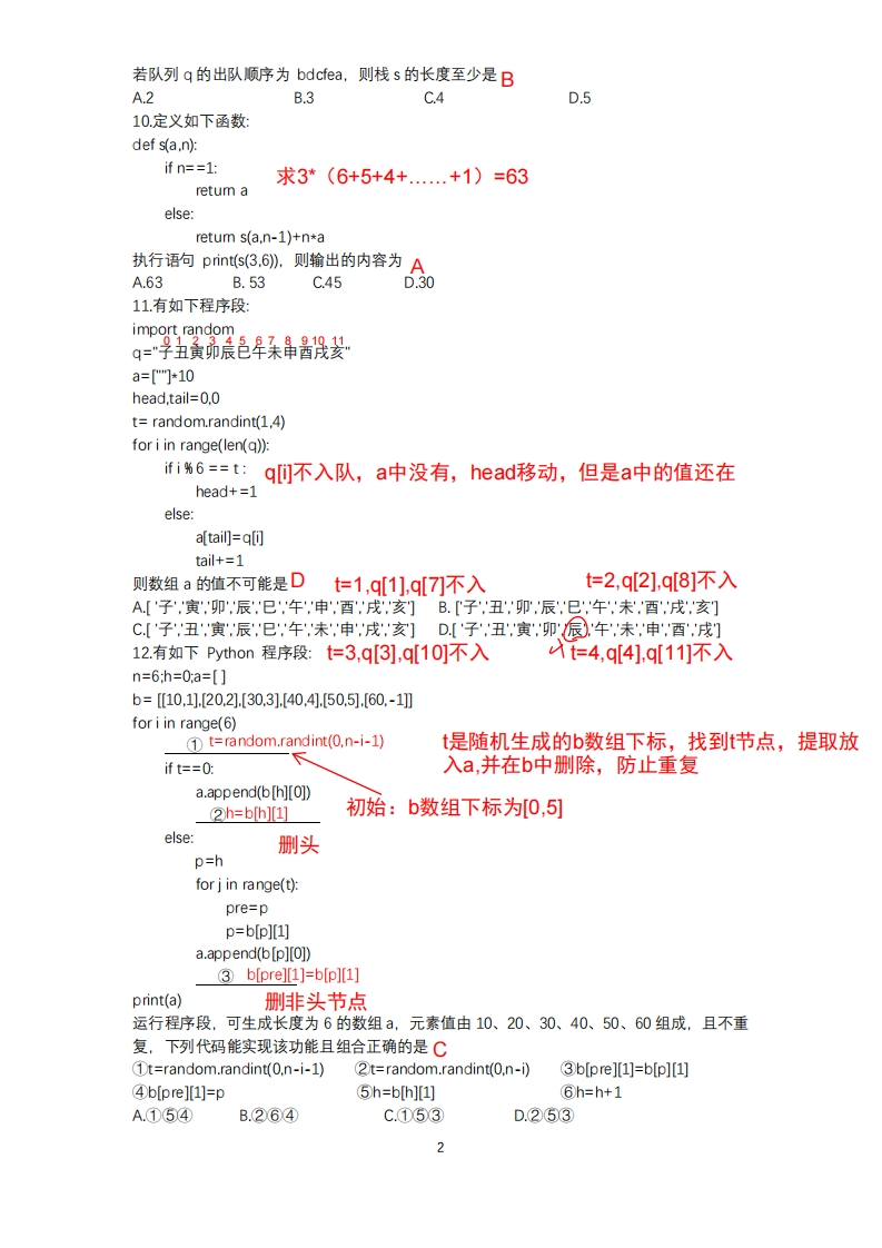 1-5 CDBAD6-10 CABBA 11-12DC高三下信息基础练习31.下列关于信息与数据的说法,正确的是CA.信息的产生不依赖于数据B.数据只能借助计算机进行处理C.人们通过相同途径获取的信息不一定相同D.数据的价值往往与其所包含的信息无关阅读下列材料,回答第2至5题。某超市安装无人值守管理系统,超市内部安装了大量的传感器和摄像头,可以实时监测商品的库存、位置和状态等信息,并自动将数据发送至远程服务中心,保证商品库存充足。顾客进入超市后,需要通过扫描二维码或人脸识别等方式进行身份验证后就可以自由选择商品,将商品放入购物车中。当顾客离开超市时,系统会自动结算购物车中的商品,并从顾客的账户中扣除相应的费用,顾客可以进入系统平台核对消费账单。2.下列有关该系统功能及组成的说法,正确的是DA.只有顾客是该系统的用户B该系统设计安全稳定,不依赖外部环境C.系统的运行可以没有通信网络D该系统的消费账单需要使用数据库3该系统运行过程中,体现人工智能技术的是BA商品无货时,自动向远程服务中心发出警报B.顾客通过刷脸进行身份验证C顾客离开超市时,系统自动结算购物车中的商品D.顾客搜索商品名称,系统提示商品所在位置4.下列关于该系统安全及社会责任的说法,正确的是AA超市摄像头实时数据传输时应进行加密B.超市收集顾客购买记录可进行网上销售C二维码进入超市的验证方式一定可靠D.顾客可通过平台查询他人的消费账单5.下列关于该超市网络系统的说法,不正确的是DA超市网络可接入无线设备和有线设备B.平台通过摄像头远程监控超市,说明硬件资源也可共享C网络协议是该超市内各终端之间能正确通信的一组标准D数十家超市分散在某城市,超市间网络应采用局域网方式6某无人售货机主控机的配置如下:CPU:Intel Celeron N5100屏幕及分辨率:10.1英寸1920x1080内存:8 GB DDR4(可扩展)固态硬盘:256G触摸屏:电容触摸输入操作系统:Windows10销售软件名称及版本:TSV1.0.2通信模块:自带4G模块,接入4G网络下列说法正确的是C应用不绝对A.销售软件TS是该主控的系统软B增加内存定可提升该设备的处理性能C该主机能进行显示、输入和存密能处理,D,该主机移动通信传输速度为4GB/S4G是4代通7某后缀为BMP的图片至少可显示③00种不同颜色,下列关于该图片的说法正确的是信技术A.图片颜色模式可能为RGB/8B.图片位深度可能为8bit至少9bitAC.图片已经过压缩处理BMP未压缩D.图片为矢量图BMP是位图8某二叉树的中序遍历结果为FBACED,后序遍历结果为FBCDEA,则该二叉树与下列二又树一致的是BACF9.已知某空队列q和某空栈s,把元素a,b,c,d,e,f依次入栈。元素出栈后再依次放入队列q,1