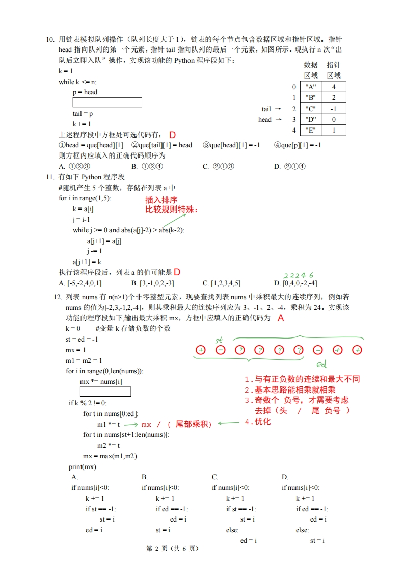 高三下信息练习卷(九)一、选择题(本大题共12小题,每小题2分,共24分,每小题列出的四个备选项中只有一个是符合题目要求的,不选、错选、多选均不得分。)1.下列有关数据、信息和知识的说法,正确的是BA.大数据技术不能处理结构化数据B.信息的存储都必须依附于一定的载体C.在同一课堂中,学生习得的知识都是相同的D.同一批数据经过不同的处理,产生的信息都是相同的2.下列算式计算结果为10H的是DA.1Hx10DB.9H+1HC.20D-10BD.10B×8D标注数据训练3.某算法的部分流程图如图所示,执行这部分流程,输出c的值是A10000B属于AI中联结主义A.9B.10C.90D.1004.下列关于人工智能的说法,正确的是Cnum-10:e-0A.人工智能不可应用于天气预测num<100?B.人工智能的实现都需要标注数据标签Y TC.深度学习是联结主义学习方法的典型代表a-um∥10:b←num%10输出eD.字符识别技术只能通过符号主义人工智能实现阅读下列材料,回答第5至7题:联结主义a-b?Y电子不停车收费系统(ETC)通过安装车载电子标签(存储c-e+1车型、车牌号等信息)与收费站ETC车道上的微波天线之间进行短程通讯,自动感应识别车辆,并进行收费数据的处理,实现um←um+】车辆通过高速公路收费站时无须停车就能交纳费用。该系统的数据存储在数据库中,车主可以通过ET℃微信小程序查询通行和第3题图支付记录。5.下列关于该信息系统组成与功能的描述,不正确的是BA.ETC微信小程序属于该信息系统的软件B.ETC维护人员不属于该信息系统的用户C.通过车载电子标签采集车辆信息,属于该信息系统的数据输入功能D.车辆ETC通行记录存储于数据库,属于该信息系统的数据存储功能6.下列关于该信息系统应用和安全的说法,不正确的是BA.收费系统每天定时备份数据,是保护系统数据安全的重要措施B.ETC微信小程序采用手机短信验证绑定车牌,可确保该系统无任何安全隐忠C.在ETC微信小程序获取电子发票,体现了系统跨越时空限制,服务随时随处的优势D.若车载电子标签电池失效,则该车无法通过ETC车道,说明系统对外部环境有依赖性7.下列关于该信息系统中传感与控制的说法,正确的是DA.车载电子标签不属于传感设备?读卡器属于传感器B.车辆不安装车载电子标签,也可以使用ETC不停车收费系统C.在车辆识别过程中,系统没有使用射频识别技术D.在识别车辆、开关禁行杆过程中,系统使用了传感与控制技术8.某二叉树的前序遍历结果为ABC,若该二叉树不是满二叉树,则其后序遍历结果为CA.ABCB.BCAC.CBAD.CAB9.队列Q从队首到队尾的元素依次为1,2,3,4,栈S初始为空。约定:H操作是指元素出队后入队,T操作是指元素出队后入栈。经过HTTHT操作后,栈S中从栈底到栈顶的元素依次为BA.12.4B.2.31C.3.12D.4,2.1第1页(共6页)