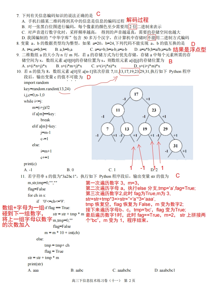 高三下信息选考练习卷(十一)一、选释题(本大题共12小题,每小题2分,共24分。每小题列出的四个备选项中只有一个是符合题目要求的,不选、多选、错选均不得分)自驾游的司机在出行前,可以通过导航软件来规划行程路线。在手机上打开导航APP,通过语音输入自驾游目的地和需求,导航软件能根据输入的信息、道路拥堵情况及个人驾驶习惯规划出几条线路供你选择。开始导航后,软件会模仿真人语音播报当前路况,当司机在驾驶途中改变路线时,导航软件会根据汽车当前位置及时更新剩下的行程路线。根据材料回答1-2题:1.上述材料中关于数据与信息的说法,不正确的是C数据的表现形式:文字、图像、声音:视频等数据的表达方式:网络、广播、电视等A.导航软件呈现的行程线路图像是数据的一种表现形B.导航软件在规划行程路线时用到了大数据技术C.不同司机输入同一目的地后,同一导航软件规划出的行程路线信息肯定是相同的D.导航软件通过GPS获得汽车当前位置信息是数据的采集2.下列关于人工智能的说法,正确的是AA.语音输入目的地开始导航是人工智能的应用语音识别是人工智能B.人工智能可以代替人类完成所有的工作行为主义灯联结主义人工智能又称为进化主义,从“交互-反馈"角度来刻画智能行为D.深度学习人工智能的实现是基于手工构造知识库和推理引擎符号主义某智慧体育测试管理系统中,通过智能终端上的RFD读写器识别身份证信息并通过摄像头进行人脸识别核对后,发出语音提示考生进入测试环节。其中自动测试100米跑的系统中位于每个跑道的红外传感器记录终,点状态,完成自动计时,相关测试成绩数据存于智能终端并同步传输至服务器中。考官可在测试中心使用专门的处理软件统计分析考试信息,测试成绩公布后,考生可在计算机中通过浏览器或通过手机专用APP查询考试信息。根据材料回答3-5题:3.下列关于该系统组成的说法,不正确的是A,RFID读写器是控制射频模块向标签发射读取信A.在该场景中RFID读写器用于输出数据号,并接受标签的应答:对标签的对象识别信息进行解码,然后将对象标识信息和标签上其他相关信B.考官和考生都属于该系统中的用户息传输到信息系统以供处理,属于输入设备。C.该系统中摄像头的分辨率影响系统的性能D.考生信息和测试结果信息都是该系统中的数据4.为提升该信息系统数据的安全性,下列措施中不合理的是BA.测试前进行系统数据库中的信息、身份证和人脸信息的核对B.统计分析成绩完成后可以关闭服务器上的防火墙C.服务器中的数据进行异地备份存储D.及时给系统服务器升级杀毒软件的病毒库5.下列关于该系统功能与应用的说法,不正确的是BA.该系统开发时采用了BS和CS两种架构B.智慧体育测试管理系统是自动测量100米跑系统的子系统C.该信息系统规范了体育测试的工作流程,提高工作效率D.利用考生体育测试数据能分析学生体育健康达标情况6.下列关于网络技术的说法,正确的是BA.网络具有资源共享功能,这里的资源是指网络中所有的软件、硬件数据资源B.计算机终端在网络中互相访问时需要网络协议C手机要访问网络中的计算机终端或服务器必费纷暴祜幕邦婴绕D.TM①是从Wb服务器传输超文本信息到本地浏览器的超文本传输协议HTTP高三下信息技术练习卷(十一)第1页