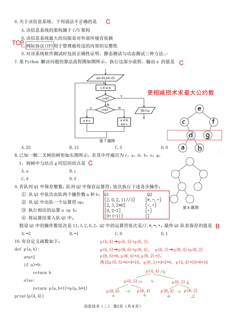 技术(二)本试卷分两部分,第一部分信息技术,第二部分通用技术。满分100分,考试时间90分钟。第一部分信息技术(共50分)一、选择题(本大题共12小题,每小题2分,共24分。每小题列出的四个选项中只有一个是符合题目要求的,不选、多选、错选均不得分)1.位于渤海南部海域的渤中26-6油田获得大发现,探明地质储量超1.3亿吨油当量,可开采原油超2000万吨,天然气超90亿立方米。下列关于数据、信息和智慧的说法,不正确的是AA.地质储量描述中2000、90等数字是信息数据B.渤中26-6油田获得了广泛的关注,体现了信息的共享性C.信息可以脱离它所反映的事物被存储、保存和传播D.根据历史地址资料,判断油田可能出现的位置,这属于知识的运用2.某APP使用大数据实时统计车流量反馈给用户,下列关于数据与大数据的说法,正确的是BA.大数据分析的是局部数据B,大数据允许个别不准确的数据存在C.数据的数字化过程先量化再采样D.该APP适合使用批处理计算处理后台数据阅读下列材料,回答第3-6题。流数据->流计算“十四五”时期是养老服务业发展的重要战略机遇期,智慧养老APP应运而生。利用智能手机、智能手环等终端设备,随时随地实现与服务器的无线通讯,创造实现一体化的老人健康信息交流共享平台。通过测试,基于Android的智慧养老系统App具有稳定性和可靠性,为老年人提供了全方位服务,缓解了养老压力,保障了养老需求。3.关于该信息系统设计,下列说法不正确的是BA.智慧手环也属于该信息系统的组成部分B.该信息系统的用户仅是指使用该系统的老人C.蓝牙技术、Wi-Fi技术、NFC技术都能实现设备间无线通信D.老人的身体数据一般存储在系统的数据库中4.该信息系统下列应用中,体现人工智能技术的是CA.将老人相关的身体数据自动保存到服务器B.系统自动生成老人一天的活动轨迹C.老人回家时通过摄像头刷脸开门D.系统自动统计老人当天异常数据发送给子女5.下列关于信息系统安全和信息社会责任的说法,正确的是AA.为保障数据安全,每天定时备份数据B.系统服务器安装了杀毒软件,数据文件不会再被病毒侵害C.使用人脸识别登录系统,可确保数据绝对安全D.系统管理员未经授权,可将老人个人信息放到电商平台出售信息技术(二)第1页(共8页)