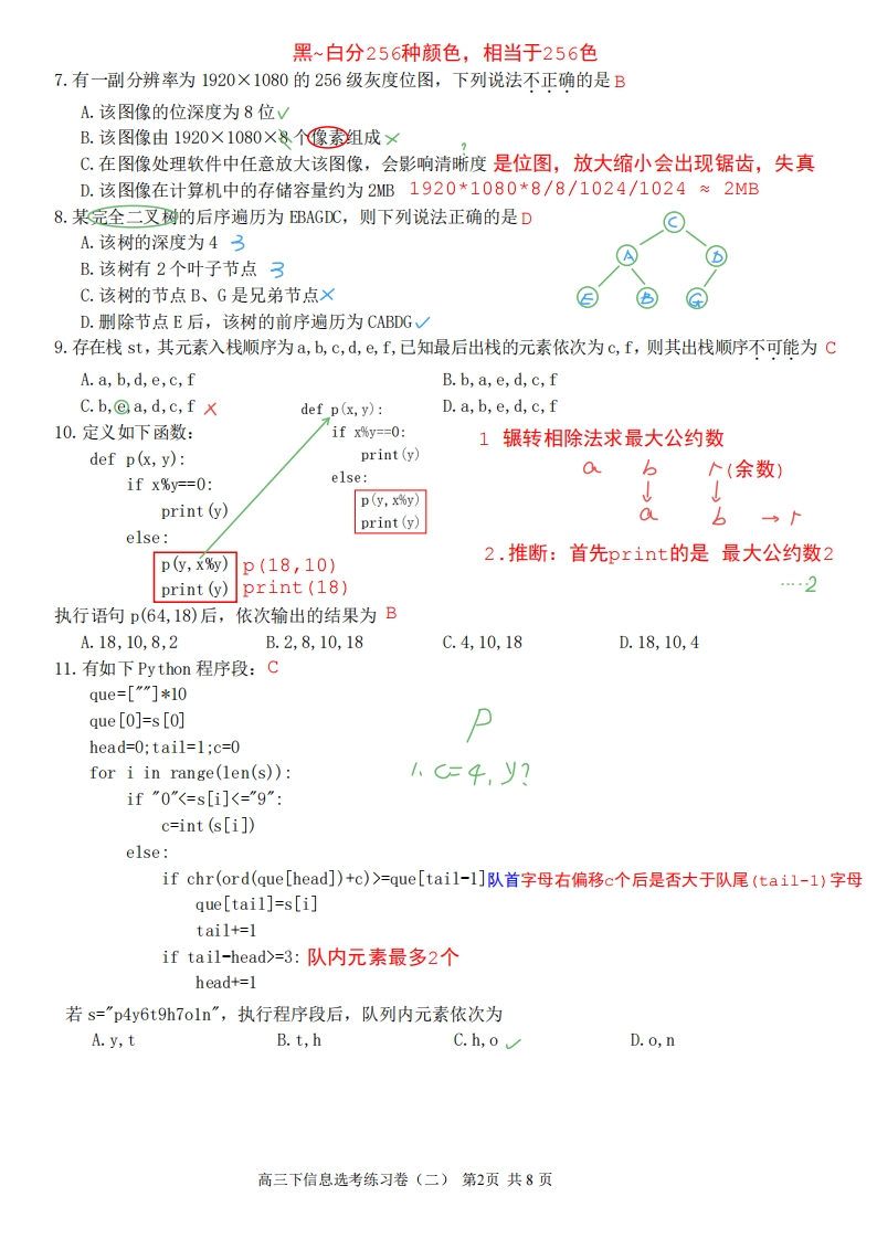 高三下信息选考练习卷(二)2024年3月3日合卷练习一、选择题(本大题共12小题,每小题2分,共24分。每小题列出的四个备选项中只有一个是符合题目要求的,不选、多选、错选均不得分)1.下列关于数据与信息的说法,正确的是AA.不同来源的数据表达的意义可能相同B.信息在共享时会发生损耗导致历史文献失传C.信息可以被处理、分析,但数据不能D.从历史数据中获取的信息不具备价值阅读下列材料,回答第2至4题:某家庭电子防盗系统的部分功能有:在入户门上集成可视化门铃,通过摄像头进行人脸识别实现为家庭成员自动开锁:当有人拜访时,自动开启录像功能并通过网络在户主手机端进行提醒,户主可通过专用pp进行实时查看并能远程为拜访人员开锁:如遇非法入侵,自动开启报警装置。所有出、入户数据加密后保存在服务器的数据库中,户主可通过专用app按日期进行查询。2.下列有关该系统的功能和应用的说法,不正确的是DA.在数据库中保存出、入户数据体现了该系统的数据存储功能B.遇到非法入侵自动报警体现了该系统的数据输出功能C.户主能远程开锁体现了该系统的跨越时空限制优势D.该系统智能化程度高,不存在数字鸿沟3.下列系统应用中,体现人工智能技术的是CA.户主为拜访人员远程开锁B.户主按日期查看某天的出、入户数据C.系统通过人脸识别为家庭成员自动开锁D.系统通过录像功能记录拜访人员情况4.下列有关该信息系统安全和信息社会责任的说法,正确的是CA.为服务器安装防火墙可抵御一切外来攻击B.将出、入户数据保存在网络云盘可有效提升安全性网盘容易泄露数据C.为家庭成员设置不同的系统权限能减少安全隐患D.户主可以私自将拜访人员的录像发布在网络上5.下列有关网络系统的说法,不正确的是DA.网络通过分布方式处理大规模信息任务设备连入计算机网络,必须要有IP地址B.局域网是覆盖范围最小的计算机网络迎地址设置方式:C.网络软件及应用程序通常安装在服务器1.可以手动设置D.移动设备接入局域网无需分配P地址2,路由器中DHCP服务器自动给终端分配IP地址6.某图书借阅机上安装了图书借阅管理系统,学生通过刷校园卡与扫描书本条形码完成自动借阅和归还书籍,下列说法正确的是AA.借阅机上的图书借阅管理系统属于应用软件B.刷校园卡与扫描书本条形码均采用了FID技术C.借阅机没有配备键盘和鼠标,因此不具备输入设备D.所有图书及借阅数据均可存放在借阅机的内存中y2RAMR.OM高三下信息选考练习卷(二)第1页共8页