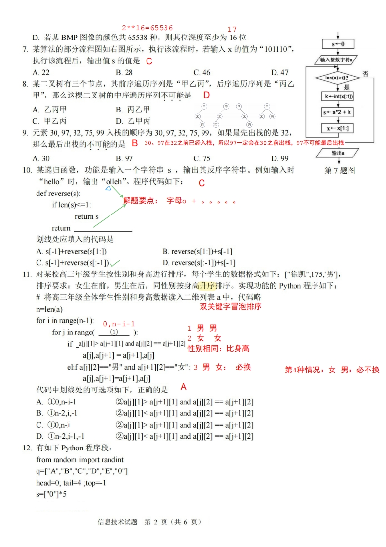 高三下信息选考练习卷(二十二)第一部分信息技术(共50分)一、选择题(本大题共12小题,每小题2分,共24分。每小题列出的四个备选项中只有一个是符合题目要求的,不选、多选、错选均不得分)L.下列有关数据、大数据和信息的说法正确的是(A)A.同一数据在不同语境中承载的信息可能不同B.数据在计算机中可以采用十六进制方式进行存储C.信息的保存和传播必须依附于载体,信息的价值永恒不变D.若数据库中的数据量特别庞大,这样的数据就可以称为大数据2.下列关于人工智能的说法,正确的是(B)深度学习:人、人的智能自然语言、语音识别、图像识别、视频处理A.在混合增强智能中,机器智能是整个智能回路的总开关B.深度学习在自然语言处理、语音识别和视频运动提取等领域表现良好多帧图像C.某人工智能系统在自我博弈中不断提升自身智能和效率,这属于符号主义D.人工智能技术的发展只依赖于计算机科学和数学,无需其他学科的支持阅读下列材料,回答第35题:浙考交流某共享电瓶车租赁系统的工作原理:用户通过手机APP扫描共享电瓶车上的二雏码,获取电瓶车的唯一编码并发送给云端服务器。云端服务器在验证用户身份和口令后,会向车控终端发送解锁命令。车控终端接收到解锁命令后,通过电控锁机制实现车辆的解锁。用户骑行结束后,车控终端检测到锁车动作后,会向云端服务器发送信号,云端服务器根据骑行时间计算贵用,并通知用户。3.下列关于该共享电瓶车系统的组成说法不正确的是CA.电控终端和扫码用的手机都属于该系统的硬件B.共享电瓶车的维修人员属于该系统的用户/信息系统相关的所有人员都是系统的用户C.手机APP以及手机上安装的操作系统组成了共享单车的软件+服务器上的软件D.共享单车的唯一编号,开锁密码等都属于该信息系统中的数据4.下列关于该共享电瓶车系统应用的说法正确的B摄像头扫码支付没有适用NFC技术,A.结算时使用支付宝支付应用了NFC技术扫校园卡、身份证用REID技术,B.用户的身份和账户等数据存储在数据库里NFC偏向于两个终端相互通信C.用户扫描二维码获取编码的过程体现了信息的编码D.根据骑行时间计算费用体现了信息系统的数据传输功能5.下列关于该信息系统安全的说法,正确的是DA.该信息系统只需要维护和升级服务器端B.对口令进行加密是为了保证系统数据的完整性C.在内网和外网之间构造防火墙可以完全避免非法用户入侵D.给管理员和普通用户设置不同的用户权限,体现了访问控制机制6.下列有关数字化及数据编码的说法正确的是CA.模拟信号转为数字信号的过程中不会产生失真连续曲线变为离散(一个个点),会存在失真B.不能通过采样、量化和编码的方式将图像信号数字化C.在相同的采样频率下,提高量化位数能提高音频的质量信息技术试题第1页(共6页)