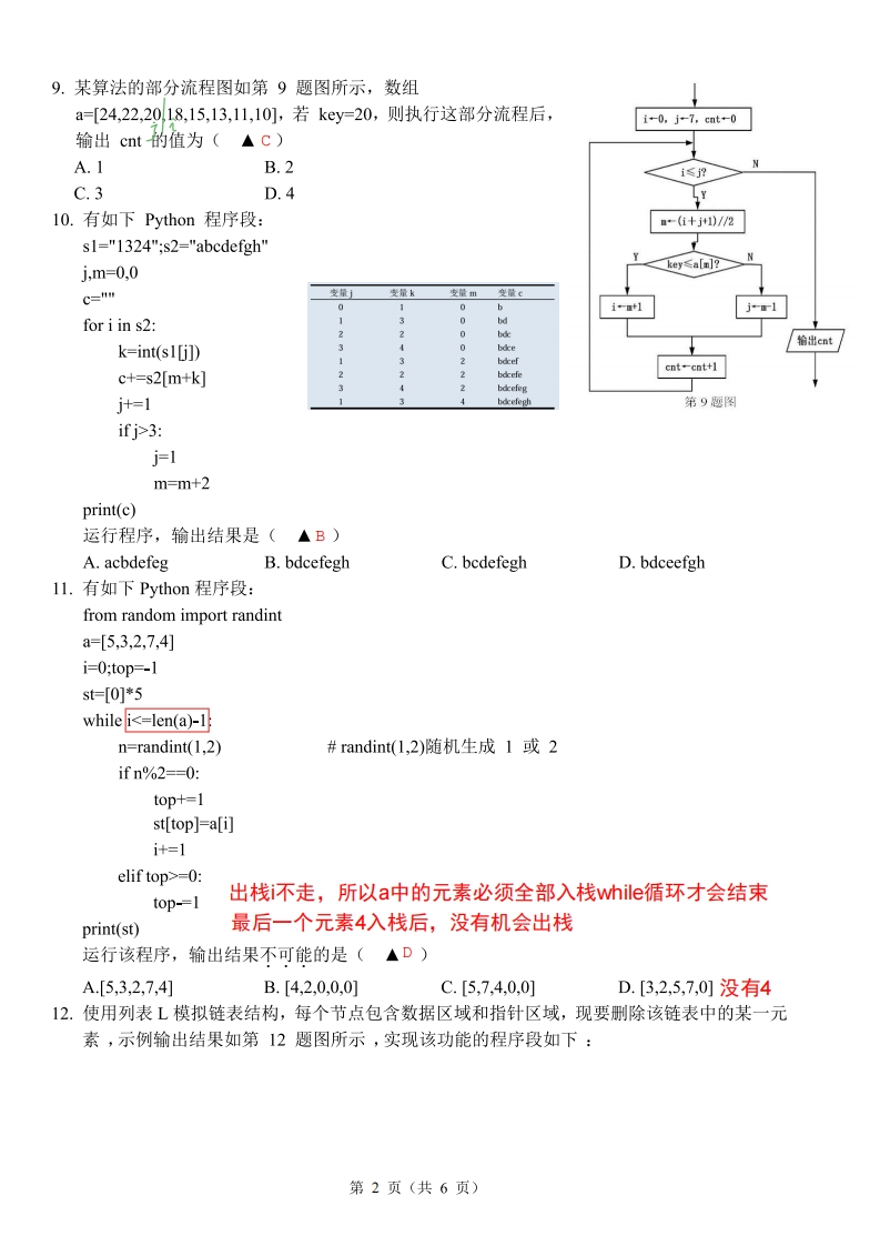 题号12答案D(二十一)一、选择题(本大题共12小题,每小题2分,共24分。每小题列出的四个备选项中只有一个是符合题目要求的,不选、多选、错选均不得分)1.下列关于数据与信息的说法,正确的是(▲D)A.数据在处理过程中不会产生新的信息B.信息在网络上传播不需要依附于载体C.在大数据处理过程中需要保证每个数据都准确无误大数据不再追求数据的精确性,而是能够接受数据的混杂性D.文字、图像、声音等数据在计算机中都以二进制存储2.下列关于人工智能的说法,正确的是(▲C)A.深度学习需要事先手工构造知识库B.联结主义人工智能包含知识库和推理引擎两部分C.人工智能技术可应用于机器翻译和自动驾驶领域D.依赖于专业知识和数据的视觉识别系统属于跨领域人工智能阅读下列材料,回答第3至6题:某娱乐票务平台,为大众提供演唱会、话剧等品类的购票、选座等服务。客户可使用手机、门口的自动售票机等设备登录APP,在线购票和选座。入场时在门口闸机处刷身份证或凭纸质门票进场,还可根据导航精准找到相应的包厢。客户可免费使用会场无线网络。3。下列关于该系统组成的说法,正确的是(▲A)室内得航技术有,硬件有,但大众手机没有“普及!A.该系统的票务平台属于应用软件B.客户使用的手机不属于该系统的硬件C.该系统的用户指的是使用系统的客户D.该系统的购票信息保存在客户手机上4.下列关于该系统功能与应用的说法,不正确的是(▲A)A,刷身份证进场采用了NFC技术二代身份证采用内置rfid技术,不属于nfc技术B.手机能精准找到包厢,是因为应用了与定位有关的传感器C.该系统会因断电受影响,体现了系统对外部环境有依赖性rfid:偏向于读取卡号D.利用客户数据分析选座喜好,是数据加工处理的过程nfc:偏向于相互通信,例5.下列关于该系统中网络技术的说法,正确的是(▲B)如两个手机“碰一碰”,通过nfc技术相互通信A,该系统的网络资源不包括会场的无线网络B.会场无线网络与互联网的连接必须有路由器通过浏览器购票,有http,C.用APP在线购票时数据传输应遵循HTTP协议通过app(c/s),不需要http.B/S、C/S都遵循的是rCP/IPD.客户的手机可通过DHCP服务器获得静态P地址6.下列关于该信息系统安全与信息社会责任动瓷法,不正确的是(▲℃)A.该系统授予用户的身份应具有唯一性B.该系统为不同用户设置不一样的权限C.在场内使用无线网络不会存在安全隐患人D.在服务器上安装杀毒软件并及时更新可有效降低病毒破坏风险可有效预防病毒7.用某软件查看字符的内码,其内码为“D6D0B9FA4368696E3F61”(不包括引号),其中ASCⅡ编码的字符个数是(▲B)A.9B.6C.5D.48.某二叉树的树形结构如第8题图所示,后序遍历结果为stnaqm,则该二叉树的中序遍历结果是(▲C)A.mntsqaB.ntsmqaC.nstmqaD.nstmaq第1页(共6页)第8题图