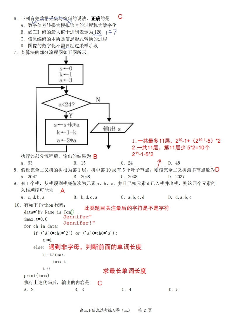 高三下信息选考练习卷(三)2024年3月4日周练一、选释题(本大题共12小题,每小题2分,共24分。每小题列出的四个备选项中只有一个是符合题目要求的,不选、多选、错选均不得分)1.下列有关数据、信息、知识的说法,正确的是DA.一张光盘上存储的文件是信息B.信息可以不依附于载体而存在C.信息在传递的过程中,会因为被获取发生损耗D.知识是人类在社会实践中所获得的认识和经验的总和2.近日,由ChatGPT引爆的新一轮人工智能热潮,使得人工智能的应用走向日常生活。以下关于人工智能的说法中正确的是AA.符号主义人工智能基于规则侧学习,需要实现构造知识库B.联结主义人工智能是在问题引导下的试错学习C.在智能叠加协调的回路中,人工智能是智能回路的总开关人类智能D.人们不必担心人工智能带来的一些社会担忧3.近日华为Mate60的发布,引发社会关注。小明的爸爸购买了这部手机,小明阅读了手机的说明书,部分参数如下表所示:运行内存(RAM)12G丙存环境光传感器机身内存(ROM)红外传感器存储币闪存传感器存储卡类型NM存储卡霍尔传感器最大支持扩展256GBNFC功能关于该手机下列说法中错误的是CA.手机的RAM相当于计算机中的内存条,断电后信息消失B.该款手机配置多种传感器,增加了移动终端的智能性C.手机的鸿蒙操作系统属于应用软件系统软件D.该手机可以实现无接触的移动支付阅读下列材料,回答第4到5题:某中学通过智慧食堂就餐系统,对食堂菜谱、菜品售卖情况、学生对菜品的喜爱度等进行大数据分析,不仅实现了学校食堂精准备餐,降低剩餐率,而且还促进了学校食堂不断优化、优选菜品,在保证营养搭配均衡的同时,逐步提升菜品质量4.有关该信息系统的说法中不正确的是AA.该信息系统的用户是指全校师生和食堂工作人员B.该“智慧食堂”系统的实现必须有数据库的支持C.该“智慧食堂”系统需要软硬件的支持D.该信息系统的使用有利于学校食堂的科学决策5.关于该信息系统的安全和防护,下列说法错误的是BA.TCP协议用于管理被传输信息的完整性√B.管理人员廷享同一个账户,可提高管理效率不安全C.该系统采用的网络类型属于局域网D.可以用替代加密等加密算法加强数据安全高三下信息选考练习卷(三)第1页