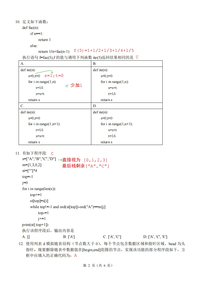 12345678910n12BBC C A高三信息选考练习卷(十二)一、选择题(本大题共12小题,每小题2分,共24分。每小题列出的四个备选项中只有一个是符合题目要求的,不选、多选、错选均不得分)1.下列关于数据和信息的说法,正确的是BA.人们在利用数据的同时,不会产生新的数据B.存储在计算机中的数据采用二进制方式编码C.同一信息在不同的时间,其价值还是相同的D.信息不能独立存在,一种信息只能依附一种载体2.下列关于人工智能的说法,不正确的是AA.人工智能应用不会威胁到公共信息安全B.深度学习是数据驱动人工智能方法之一C.符号主义人工智能包含知识库和推理引擎两个部分D.AlphaGo从围棋跨界到电力控制领域属于跨领域人工智能阅读下列材料,回答第3至第5题:某超市智能管理系统的部分功能是:系统可以实时更新商品库存信息,预测未来一段时间内的销售趋势,帮助超市调整进货策略;同时智能推送信息到客户端APP,顾客可通过客户端购买商品。为保障系统的安全与稳定,该系统配置了硬件防火墙和不间断电源。3.下列关于该信息系统的说法,正确的是DA该系统的用户只有顾客和店员B.该系统的客户端软件属于系统软件C.该系统软件开发架构一定是B/S架构D,该系统配置的不间断电源属于信息系统硬件4.下列关于该系统中数据的说法,正确的是DA.该系统中存储的数据是大数据B.商品的库存数据都存储在客户端中C.该系统预测的销售趋势一定是准确的D.查询某商品的方澌是属于数据查询功能5.下列关于该信息系统安全的说法,正确的是C内网外网A.为所有员工设置相同的权限防火墙:阻止外网攻击、以及内网访问外网的监控B.该信息系统采用了软件防火墙技术可以是软件,或专门的硬件设备,■警os0秋C.定期备份服务器中的数据,可以提高系统的安全性方便进行某些调试和测试而预留的一些特权,通D.为了方便后期的升级和维护,可以给系统设置后门过这些预设的特权,他们可以不经过安全检查而6.下列关于网络技术说法,正确的是C获得访问权。但不安全A.移动设备接入局域网不需要传输介质B.网络的最基本功能是资源共享C.TCP协议的功能是管理传送内容的完整性D.移动通信是指移动设备之间的通信7.x为实型数据,下列表达式能实现“四舍五入,保留2位小数”功能的语句是DA.y=int(x*100)/100B.y=intx)*100+0.5×int((x+0.005)*100)/100C.y=(x*100+0.5)/100D.y=int(x*100+0.5)/100√8.某完全二叉树共有300个节点,该二叉树的高度是B8层(28-1=255)满,9层未满A.8B.9C.10D.119.队列q中队首至队尾元素依次为“A,B,C,D,E,F”,约定:S为出队操作,U为出队再入队操作,若要使队列q队首至队尾元素依次为“B,D,E”,下列操作可实现的是BA.USUSSUB.SUSUUSC.SSSUUUD.SUUSUS第1页(共6页)