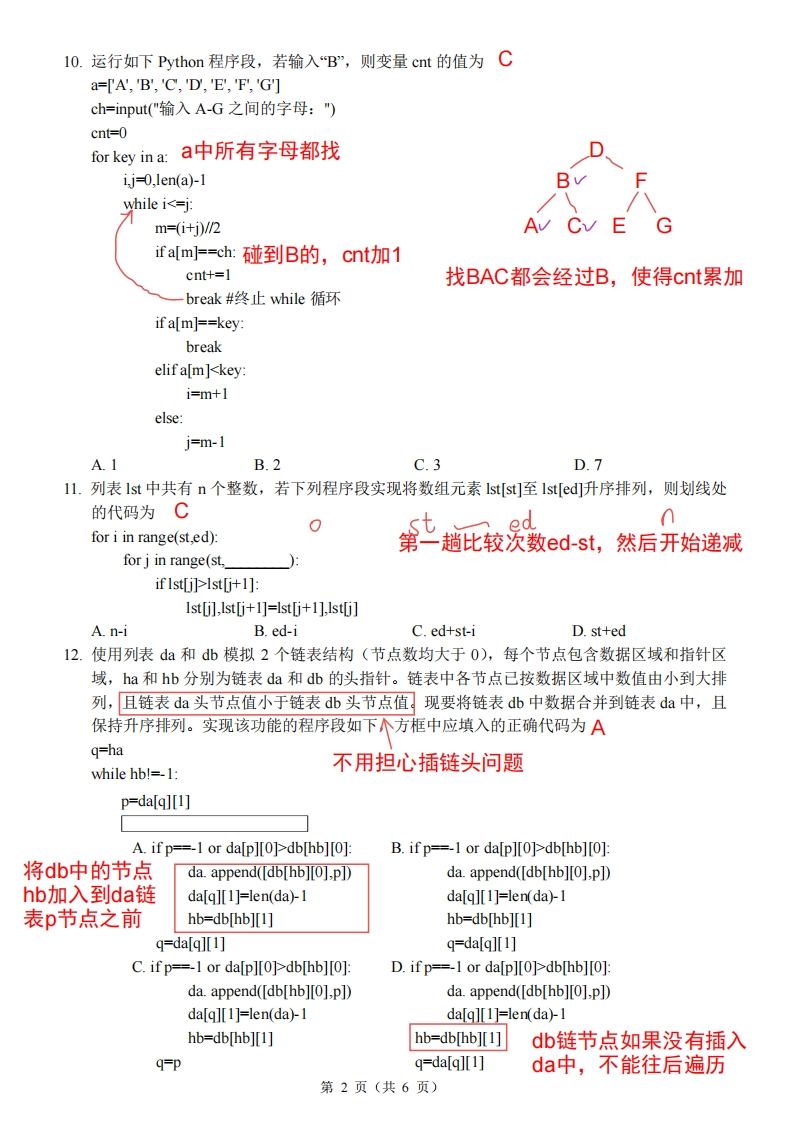 高三下信息选考练习卷(十四)一、选择题(本大题共12小题,每小题2分,共24分,每小题列出的四个备选项中只有一个是符合题目要求的,不选、错选、多选均不得分。)1.下列关于数据与信息的说法,正确的是DA.数据的表现形式只能是文字和图像B.大数据的数据体量大,价值密度高C.信息经过加工处理后不能被重复利用D.同一信息可以依附于不同的载体阅读下列材料,回答第2至3题:某医院网上预约挂号系统有预约挂号、信息查询、用户留言等功能。用户在系统中注册并实名认证后,可凭借个人账号登录系统,进行查询与预约。医院科室可统计预约数据,调整出诊医生数量。系统留言区供用户与医生进行交流。2.下列关于该系统功能和应用的说法,不正确的是AA.该系统不具备数据输入功能B.统计预约数据体现数据加工处理功能C.网上预约跨越了时空的限制D.为方便特殊用户,系统可增设电话预约功能3.下列关于该系统安全和信息社会责任的说法,正确的是AA.实名认证有助于减少恶意预约B.可对不同用户设置相同的操作权限C.医院可以给附近药店共享用户个人信息D.用户可以在留言区随意发表观点4.下列关于计算机硬件和软件的说法,正确的是CA.存储器中不能存储程序代码B.计算机性能仅取决于中央处理器C.软件不能独立于硬件存在D.鸿蒙系统Harmony OS)是常见的应用软件5.下列关于网络技术的说法,正确的是A系统软件A.路由器能实现将局域网接入互联网B.同一个局域网内的设备通信不需要遵循网络协议不管是不是同一局域网,只要通过网络都需要遵行网络协议。C.移动终端之间通信必须通过移动通信网络D.服务器是构建计算机网络不可或缺的设备6.下列关于人工智能的说法,正确的是DA.强化学习必须包含知识库与推理引擎深度学习的效果从设立模型开始,到数据B.深度学习的效果仅取决于训练数据规模的选取,到数据训练规模都有关系C.人脸识别技术是行为主义人工智能的典型代表D.图灵测试是测试机器是否具有智能的一种方法7.下列关于编码的说法,正确的是D128A.计算机内部数据采用十六进制编码B.7位二进制能表示256种颜色&发头入输合税殿输入法对发压足编过则可能的出栈序列为Bk←-0,f-0,i-1A.d.c.b.a B.b,ad,cia[i]?9.某算法的部分流程图如第9题图所示,若的值为6,TY数组元素a0]至an-l]依次存放2,0,1,0,0,1。k-k+1a[i-1]a[i]?执行这部分流程后,输出f的值为Bf-f+k,k-0A.1B.2i-i+1C.3D.4第1页(共6页)输出f第9题图