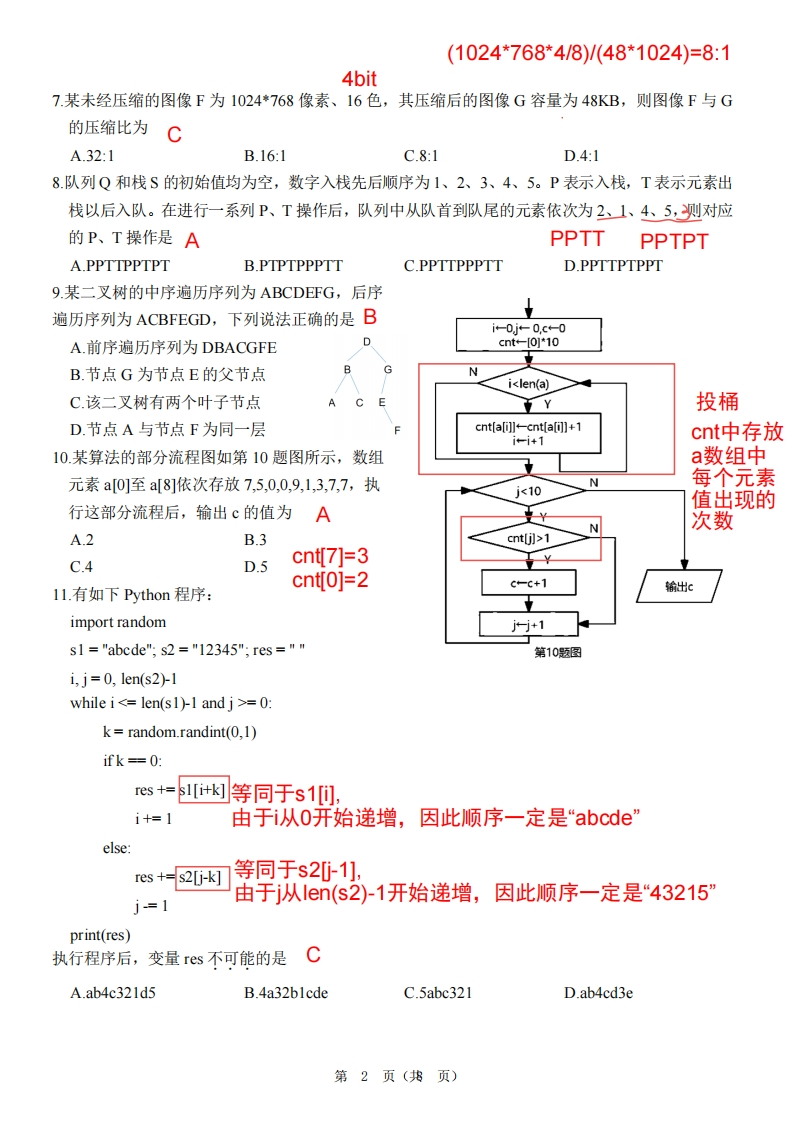 高三下信息选考练习卷(七)一、选择题(本大题共12小题,每小题2分,共24分。每小题列出的四个备选项中只有一个是符合题目要求的,不选、多选、错选均不得分)1.下列关于数据与信息的说法,正确的是AA.经过数字化的数据才能被计算机存储和处理B.大数据的数据分析常采用抽样数据的方法C.大数据价值密度的高低与数据总量的大小成正比D.同一信息不可以依附于不同载体2.下列关于信息系统安全与信息社会责任的说法,正确的是BA.同一明文采用相同加密算法不同的加密密钥加密后,得到的密文相同B.安装了防火墙,信息系统也有可能受到非法用户入侵C.自媒体时代的到来,使得人们可畅所欲言,无需考虑道德约束D.只要国家立法完善和行业自律,就可实现个人信息的保护3.下列关于人工智能的说法,正确的是BA.专家系统是联结主义人工智能方法的典型应用B.符号主义人工智在对某些知识精确化编码时存在困难C.强化学习需不断试错与调整学习方法,事先需知道问题的最终答案不知道答案D.人机协同的太空机器人,人工智能是其智能回路的总开关阅读下列材料,回答4-6题:人类智能在某校园的一卡通系统中,学生凭借校园卡完成校内图书借阅、食堂用餐以及超市消费等事项,并通过电子班牌实现签到与签退。同时,教师与家长可随时随地通过计算机或手机等终端的浏览器,查询学生在校园内的相关动态。4.下列关于该信息系统的说法,正确的是CA系统的用户仅指学生、教师和家长B.系统的硬件尽包括校园卡和读卡器C.系统重要服务器一般都需配备UPS(不间断电源)D.学生的所有相关信息都保存在校园卡上服务器上5.下列关于该系统功能和应用的说法,不正确的是DA.学生刷卡签到时,使用了数据输入功能B.为保证数据安全,需要定期备份数据C.可通过学生的消费数据分析学生消费习惯D.校园卡内置的芯片会主动向读卡器发送数据6.下列关于该系统中网络技术的说法,不正确的是C无源电子标签不会主A.查询学生信息的URL(网址)中包含服务器地址信息动发送B.路由器开启DHCP服务后,终端设备可以获取到动态地址C移动终端访问系统服务器时,两者必须在同一局域网内不一定在同一局域网内D.终端设备接入路由器,通常情况两者的P地址属于同一网段第1页(坞页)