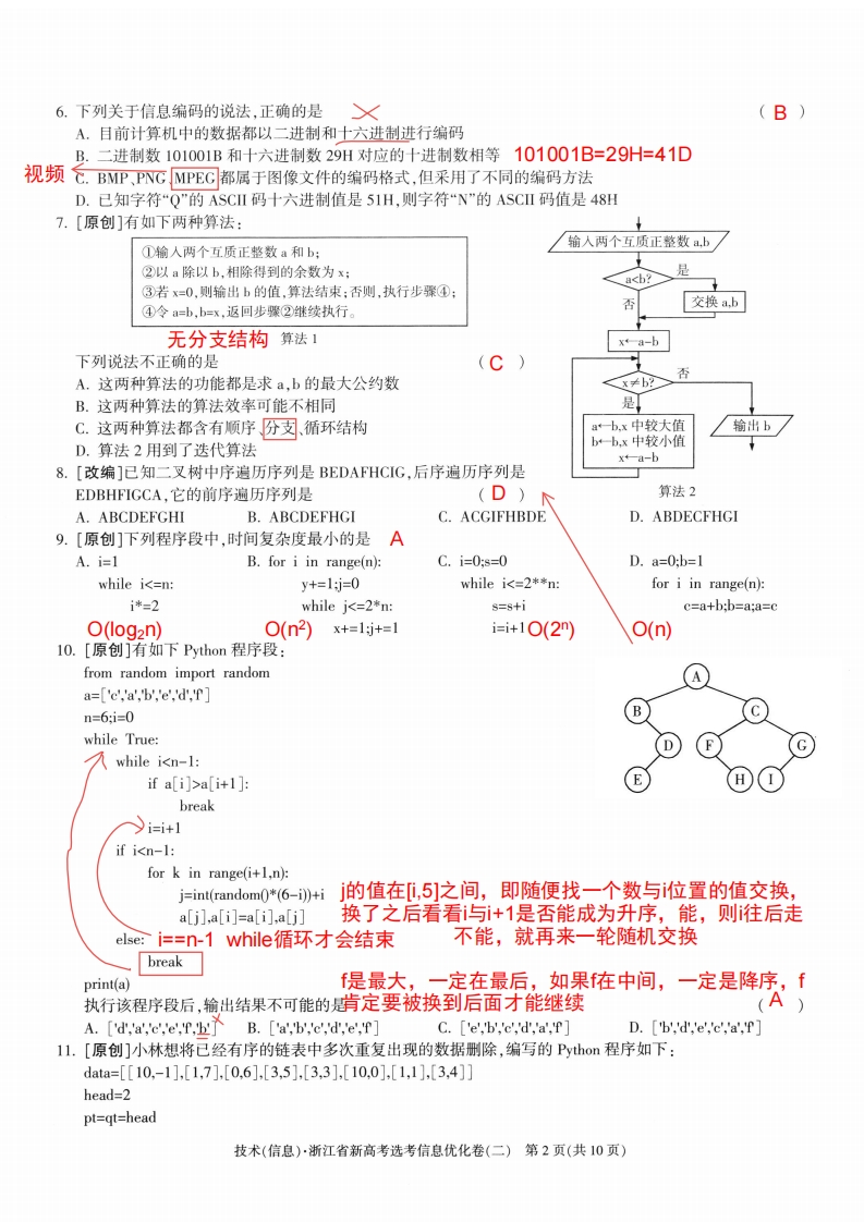 绝密★考试结束前浙江省新高考选考信息优化卷(二)技术姓名:准考证号:本试题卷共10页,满分100分,考试时间90分钟。考生注意:1.答题前,请务必将自己的姓名、准考证号用黑色字迹的签字笔或钢笔分别填写在试题卷和答题纸规定的位置上。2,答题时,请按照答题纸上“注意事项”的要求,在答题纸相应的位置上规范作答,在本试题卷上的作答一律无效。3.非选择题的答案必须使用黑色字迹的签字笔或钢笔写在答题纸上相应区域内,作图时可先使用2B铅笔,确定后必须使用黑色字迹的签字笔或钢笔描黑,答案写在本试题卷上无效。第一部分信息技术(共50分)】一、选择题(本大题共12小题,每小题2分,共24分。每小题列出的四个备选项中只有一个是符合题目要求的,不选、多选、错选均不得分)1.下列关于数据与信息的说法正确的是(B)A.数据和关于数据的解释是相互独立的B.计算机已成为处理数据的主要工具,帮助人们更方便地处理数据C.数据是信息的载体,虚假的信息可以不依附于载体D.信息经过加工、处理后一定会产生更高的价值2.以下行为符合信息安全要求的是(B)A.扫描商场二维码填写信息领取优惠券B.在云盘谨慎存储个人重要资料或隐私信息C.经常在公共场所“蹭网”D.安装杀毒软件后不需要再更新3.[原创]某交通导航APP能够告诉你在地图中所在的位置,以及你要去的那个地方在地图中的位置,并且能够在你所在位置和目的地之间选择最佳路线,行进过程中若遇到转弯处会提示左转或右转。下列说法正确的是流计算(C)A.该APP数据处理采用批处理计算模式,实时更新导航线路B.该APP中采集到的个人所在位置信息无须加密处理C.随着数据采集量的增加,导航APP会变得越来越智慧D.该导航APP采集到的数据都是结构化数据图像、视频属于非结构化数据据麻省理工学院等大学进行的一项研究发现,微创手术广泛采用了机器人系统,但手术过程中,因用户误操作、软件故障等问题,仍出现了不可忽视的技术困难和并发症。据美国食品和药物管理局数据显示,2000年至2013年间,有至少144人在机器人辅助手术过程中死亡。阅读材料,完成第4-5题。4.[原创]下列说法不正确的是混合增强智能(A)A.手术中采用的机器人系统属于跨领域人工智能,人与机器人配合缺一不可B.深度学习是一种对原始数据所蕴含的特征模式进行学习的算法模型C.人工智能技术推动人类社会进步,也可能威胁人类安全D.领域人工智能具有强大的存储、记忆和搜索功能5.[原创]下列有关信息系统的说法不正确的是(C)A.医院的健康预警系统可基于数据分析,支持科学决策B.医疗机器人系统主要用于伤病员的救援、转运、手术和康复,属于信息系统C.材料中,医疗机器人出现的技术困难主要原因是该机器人系统对外部环境有依赖性系统本身有安全隐患D.人类智能是智能回路的总开关,体现了信息社会是以人为本的技术(信息)·浙江省新高考选考信息优化卷(二)第1页(共10页)