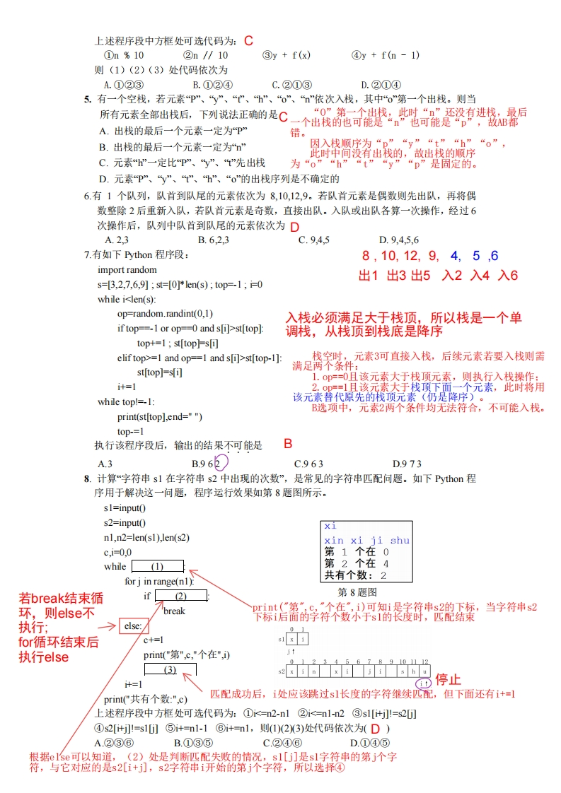 选择题答案:1-5 DCDCC6-8DBD高三信息选考基础练习1.定义函数isPalidrome用于判断回文字符串:def isPalidrome(s):先判断字符串的首尾两个字符,如果不相等即结束递归,if len(s)<=1:返回False,否则继续缩小规模去掉首尾两个字符,继续调用递归函数,直到字符串长度为1,如果能走到这里说return True明前面所有的首尾字符都相等,即为回文串,返回Tu。elif s[O]!=s[len(s)-1]:根据此思路,e1se处应返回继续调用函数,但规模为去掉首尾字符return Falseelse:return己知代码划线处可选语句为:DisPalidrome(s[1:-1])2isPalidrome(s[2:-1])3isPalidrome(s[1:len(s)-1])④isPalidrome(s[2:len(s)-l]),则可填入的语句是DA.②或③B.③或④C.①或②D.①或③2.有如下Python程序段:#程序段1#程序段2def fac(n):def fac(n):s=1迭代0(n)if n 1:递归0(n)for i in range(1,n+1):return 1ss*ielse:return sreturn n*fac(n-l)#①print(fac(⑤))print(fac(5))下列关于两个程序段的说法,正确的是CA.程序1和程序2都使用了递归算法B.若问题规模为,程序1和程序2的时间复杂度不同C.若程序1中问题规模为n,则n的值就是其循环执行的次数D.若程序2中自定义函数内的代码只保留①处语句,也能获取到目标值递只算法进没有出口,即没有结束条件,不能3.有两个自定义函数如下:实现算法要求的目标def pl(a,b):def p2(a,b):if b==0:if b==0:return 1return 1ifb%2=0:return a*p2(a,b-l)】return pl(a,b//2)*p1(a,b//2)else:return a pl(a,b-1)下列说法不正确的是DA.p2(2,3)的返回值为8p2(2,3)=2*和2(2,2)=2*(2*p(2,1)=2*(2*(2*p(2,0)=2*(2*(2*1))=8B.函数p2的时间复杂度是O(n)p1(2,3)C.函数p1和函数p2均采用了递归算法=2*p1(2,2)D.计算p1(2,3),函数p1的调用次数为生6,=2*2*012,0)*2*30)=2*p1(2,1)p1(2,1)4.定义如下递归函数,计算正整数n的每位数字之和,例如=123,函数返回值为6。def f(n):X三(1)n/10if x ==0;return nelse:y=(2)n%10return3)y+f(x)