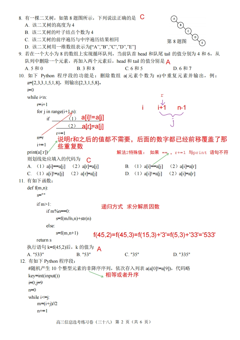高三信息选考练习卷(三十八)1阴1旧练习一、选择题(本大题共12小题,每小题2分,共24分。每小题列出的四个备选项中只有一个是符合题目要求的,不选、多选、错选均不得分)1.下列有关数据和信息的说法,正确的是CA.数据的表现形式只能是文字和数字B.信息可以不依附载体独立存在C.计算机只能处理数字化后的数据D.信息具有价值性,同一信息对所有人而言价值是相同的阅读下列材料,回答第24题某酿酒公司用智慧酒窖系统实时监测酒窖环境状态。该系统通过传感器获取酒窖环境的湿度、温度等数据,并存储在服务器数据库中;酒窖管理人员可通过刷脸或指纹等认证方式进入酒客,同时可通过手机APP登录系统查看酒窖的相关数据;游客可通过手机APP了解酒文化并预约参观酒窖,以刷身份证的方式进入酒窖。2.下列关于该系统组成和功能的说法,不正确的是BA.材料中描述的手机APP属于应用软件B.游客不属于该信息系统中的用户C.该系统具有数据采集、处理和存储的功能D.该系统设计合理,但不可避免地存在一些局限性3.该系统的下列应用中,体现人工智能的是DA.通过传感器采集酒窖环境数据B.采集的数据自动发送到服务器中C.游客通过刷身份证进入酒窖D.管理人员通过指纹认证进入酒窖4.为提高该信息系统的安全性,以下做法不正确的是CA.定期备份服务器中的数据B.定期对服务器杀毒软件进行更新升级C.为酒窖管理人员设置统一的账号密码坊便登录系统D.为游客身份信息进行加密处理5.下列关于网络系统的说法正确的是D还有软件、硬件A资源共享仅指网络中所有数据资源被网络中的所有用户共同使用广播电穆⑧缘通信网络具有频带宽、容量大、功能多、成本低、抗干扰性强等多种优势应用程序协议C.在Internet上传送信息至少通过三层协议:网际协议、传输控制协议及网页传输协议D.使用PPPoE上网连接方式只要在路由器的WAN口设置中输入PPPoE用户名和密码即可6.下列关于声音和图像数字化的描述,正确的是DA.手机播放音乐的过程属于音频信号数字化我们听到音乐是模拟信号B.若某段声音量化值范围是0128,则量化位数至少是7位回8bt矢量图放大后不失真C.矢量图形保存的文件大小一般比位图小,所以在图像处理软件中放大会影响清晰度D.一段时长50秒、采样频率44100Hz、量化位数16bit未压缩的立体声音频存储容量约为8.4MB7.某算法的部分流程图如图所示,执行这部分流程,若输出k为3,输入5的值则输入s的值可能是Ci0k=1☐卡重A."AAABB"