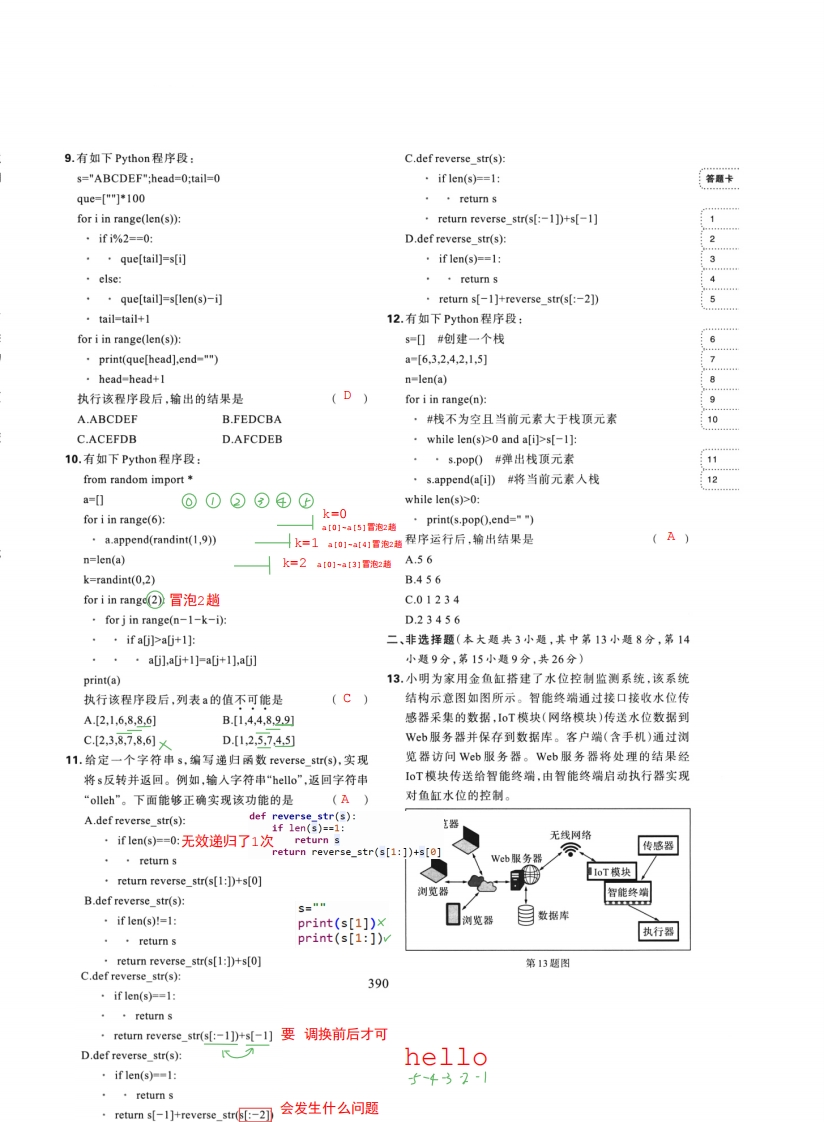 1~5CBBAA6~10 CCCDC11~12AA浙江省普通高校招生选考科目考试C.计算机硬件中的运算器和控制器负责信息的处理D,一个完整的信息系统一般具备数据加工处理功能信息技术模拟卷(三)5.下列关于数据的说法,不正确的是(A)一、选择题(本大题共12小题,每小题2分,共24分。每小A,采集到的人脸图像属于结构化数据非结构化数据题列出的四个备选项中只有一个是符合题目要求的,B.该系统中的所有数据以二进制形式存储不选、多选、错选均不得分)C.该系统中的账户数据存储在数据库中1.下列关于数据和信息的说法,不正确的是(C)D.数据发送到服务器端时需遵循TCP/IP协议A.数据是对客观事物的符号表示,它有多种表现形式6.下列关于计算机网络的说法,正确的是(C)B.同一信息依附于不同载体,因此人们获取信息的方法A.在网络中用于提供P地址分配服务的是DNS服务器可以不同B.网际协议(IP)用于管理被传送内容的完整性C.数据也是可以被捏造的,捏造出来的数据无法承载任C.URL用于在网络中定位文件,一般由网络协议、服务何信息器地址、文件名三部分组成D.未经数字化的信息不能被计算机处理D,局域网可以实现网络中的数据资源共享,但无法实2.电商客服机器人搭建以数据驱动为核心的A1算法模现硬件资源共享型,通过服务数万客户积累海量真实语料,进行深度现7.某算法的部分流程图如图所示,执行这部分流程,输出练,其中主要体现的人工智能方法是(B)a,b的值分别是(C)A.符号主义B.联结主义开始C.行为主义D,建构主义阅读下列材料,回答第3至5题。a+1,b+-0某校打造智慧食堂,引入了智能结算系统。管理萸通过网页平台进行师生账户管理、莱品管理和查询记录等操b≤162/输出a,b作。师生在用餐前仅需将盛有菜的碗碟放到结算台,结算b*-a+b台的读写器读取碗碟中的电子标签信息并计算价格,摄像(结束头采集人脸信息,结算台的软件将人脸信息和消费金颜一a%2==02同发送至服务器,服务器进行人脸识别并返回扣费信息至+-2*aa-3"a-1拟结算台b-b+1第7题图A.1632B.1616C.3232D.32168.某二叉树如图所示,其后序遍历结果是(C)第3至5题图3.该系统采用人脸识别技术进行身份认证,该认证技术属于(B)A.用户名+口令B.生物特征识别C.USB KeyD.访问控制H4.下列关于信息系统组成和功能的说法,不正确的是(A)第8题图A.信息系统的用户包括信息系统的使用者,但不包括A.FBADCEGIH程序设计员B.ABCDEFGHIB.摄像头采集人脸信息体现了该系统具有数据收集和C.ACEDBHIGF输人功能D.HBGADICEF389