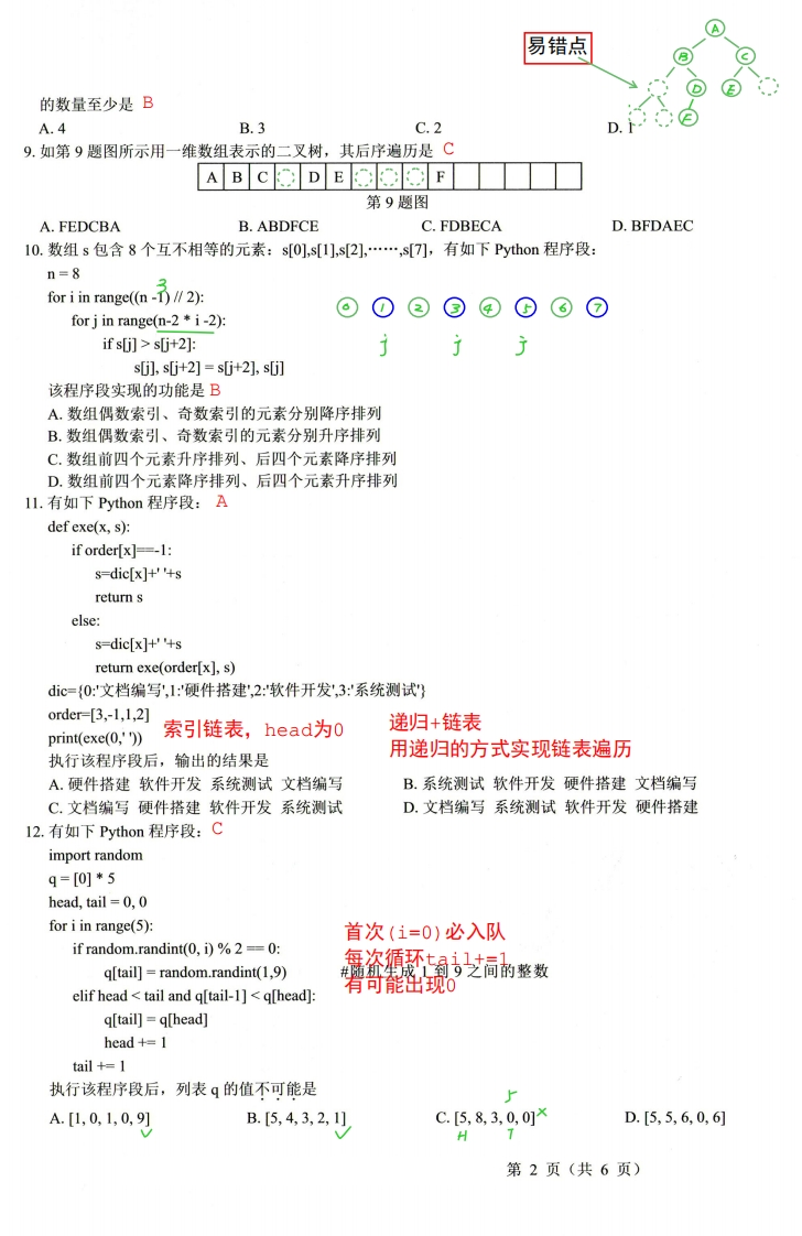 1~5 CDCBA 6~10 DCBCB 11~12 AC高三信息选考练习卷(四十一)第一部分信息技术(共50分)一、选择题(本大题共12小题,每小题2分,共24分。每小题列出的四个备选项中只有一个是符合题目要求的,不选、错选、多选均不得分)1.下列关于数据和信息的说法,正确的是CA.计算机可以直接保存各种形式的数据xB.数据是信息经过分析、解释后得到的C.信息能反映事物某一特定时间内的状态√D.信息的价值不会随时间的推移而变化以阅读下列材料,回答第2至第4题。“智能迎宾系统”中的机器人通过读取身份证收集客户资料:通过基于深度学习的人脸识别完成客户的认识和鉴别:通过自然语言交互完成客户引导和服务咨询,也可以与人工客服协同工作。机器人收集的客户资料和客流数据存储在服务器的数据库。microbit可以存储程序、数据数据库:只能存储数据2.下列关于该系统功能和应用的说法,不正确的是DRFID卡(借书卡):只存储卡号,不存储借书信息A.该系统是人机交互系统B.该系统具有数据存储的功能C.该系统缓解人工接待的压力,提高了工作效率D.机器人自带电池,对外部环境没有依赖性<3.下列关于该系统人工智能技术的说法,正确的是C自带电池正说明了对外部环境有依赖性A.基于深度学习的人脸识别属于符号主义人工智能联结主义B.自然语言交互不属于人工智能技术YC.机器人与人工客服协同工作属于混合增强智能√D.该系统取代了部分工作岗位,不利于经济发展4.下列关于该系统软硬件的说法,正确的是B资锻设备电美育A.机器人用于读取身份证的设备属于电子标签B.该系统使用的摄像头和麦克风都属于输入设各√C,服务器中的数据库属于硬件设备不属于硬件D.机器人不需要安装软件5.下列关于信息安全和信息社会责任的说法,正确的是A机器人:安装了控制器(类似Microbit)传感器、执行器的装置A.手机号码和指纹都属于个人敏感信息B.密码学的口令与密码是相同的,均用于认证用户身份加密密钥==解密密钥属于对称密码体系C.通过短信验证码登录某支付平台属于访问控制属于身份认证D.自己购买的软件,未经版权人允许可以复制给朋友使用6.下列关于网络技术的说法,正确的是DA.家庭局域网中的调制解调器就是路由器调制解调器俗称光猫B.网际协议(P)用于管理被传送的内容的完整性C.信息系统中的客户端浏览器访问服务器只需要遵循HTTP协议×tcP/iphttP3个二进制位最多:8种D.浏览器地址栏中输入的网址也叫做URL√4个二进制最少9种,最多16种7.用二进制数对一个二维表格的行号和列号进行编码,都至少需要4个二进制位,则它的格子数至少有C16A.16个B.64个C.81个D.256个8.有若干个最大长度均为3的栈,初始为空,入栈时必须大的元素在下,小的元素在上,经过一系列入栈出栈操作,若元素入栈的顺序是6,4,3,2,7,1,5,出栈的顺序是1,2,3,4,5,6,7,则需要栈16的数量至少是BA.4B.3C.2D.1元素个数为7个,栈长度为3,说明理论上至少3个栈,排除CD尝试找到仅用3个栈的入栈方式:可能多种解法