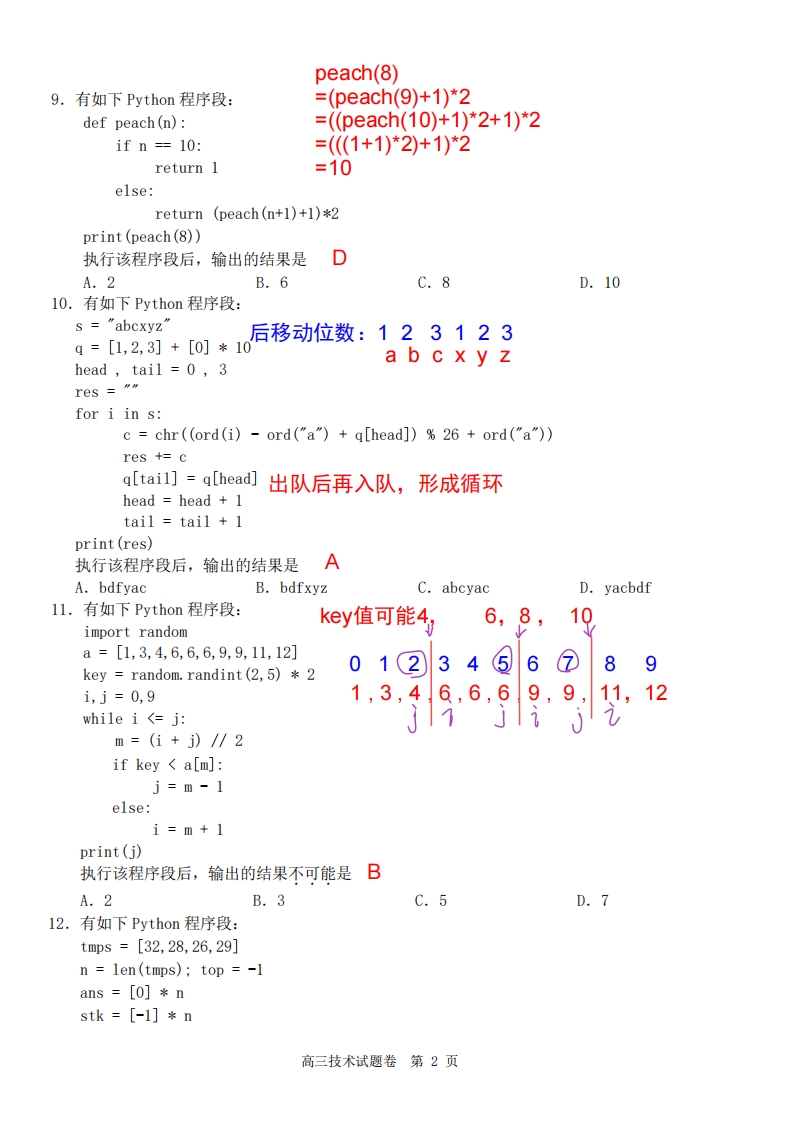 高三信息选考周练试卷(二十)一、选择题(本大题共12小题,每小题2分,共24分。每小题列出的四个选项中,只有一个符合题目的要求,不选、多选、错选均不得分)1.下列关于数据和信息的说法,正确的是CA.数据的表现形式只有数字B.信息不可以被重复利用C.数据的意义需在某一特定情境脉络下呈现D.所有的字符在计算机中以ASCII码存储2.下列关于人工智能的说法,不正确的是BA.深度学习是一种典型的基于数据驱动的人工智能方法二进制B.强化学习是根据事先知道的最终答案进行相应调整的学习方法C.AlphaGo从围棋领域到电力控制领域是跨领域人工智能的应用D.人工智能将会逐步取代高度重复或按部就班的工作阅读下列材料,回答第3至5题。12306是中国铁路客户服务中心网站,于2010年春运首日开通并进行了试运行。2013年12月,12306手机客户端正式开放下载。用户在该网站可查询列车时刻、票价、余票、代售,点、正晚点等信息,并随时随地在手机上购买车票、完成支付,在自助设备上还能完成自助取票等流程。3.关于该信息系统的组成,下列说法正确的是DA.高铁站的自助取票设备不属于该系统的硬(B.该信息系统的用户仅指购买车票的乘客C.该手机客户端属于系统软件应用软件D.该系统采用了B/S和CS两种架构4.下列关于该信息系统中数据的说法不正确的是AA.手机上购买车票的数据仅存储在手机里B.车次数据需要存放在该系统数据库中C.用户搜索车次和坐席信息属于数据查询功能D.车次余票数量的计算需在服务器端完成5.下列关于该信息系统安全性的说法,不正确的是CA.购买车票时需要核验用户的身份证信息B.维护系统时仍需开启防火墙C.用户的手机号码是个人一般信息可以随意公开×D.重要数据加密的同时也需要进行备份6.下列关于网络技术的说法,正确的是CA.5G是指数据传输速率可达约5Gbit/sT℃B.HTTP协议管理被传送内容的完整性C.服务器负责数据处理和网络控制,是网络的主要资源D.不同的终端进行通信必须连接计算机网络也可以是移动通信网络Ibìtot7.相同像素大小的两幅图像,分别由黑白像素和种颜色像素组成,其容量大小之比为AA.1:8B.1:1C.1:128D.1:256A8.已知一棵二叉树如第8题图所示,下列说法正确的是BA.树的高度是4,节点F是唯一的叶子节点BFE都是叶子节点BB.中序、后序的遍历方式,节点F先于节点D、E访问C.前序遍历的结果为A-B-C-D-EF(DED.使用数组可以表示为A',B,‘C,’,‘E,F’]F第8题图高三技术试题卷第1页