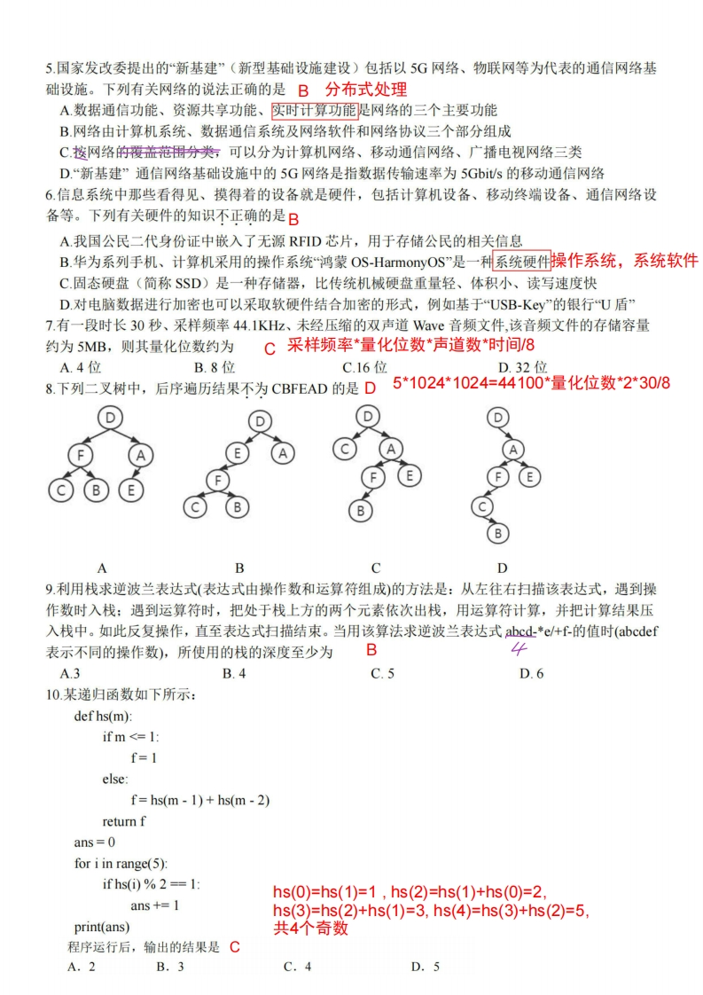 高三信息选考周练(二十三)考生须知:1.本卷共14页满分100分,考试时间90分钟。2.答题前,在答题卷指定区域填写班级、姓名、考场号、座位号及准考证号并填涂相应数字。3.所有答案必须写在答题纸上,写在试卷上无效。4.考试结束后,只需上交答题纸。第一部分信息技术(50分)一、选择题部分(本大题共12小题,每小题2分,共24分。每小题列出的四个备选项中只有一个是符合题目要求的,不选、错选、多选均不得分)1.下列有关数据、信息与知识的说法不正确的是DA一个U盘中存储了若干个文件,这些文件是数据B.不同的人面对同样的信息,因个人理解不同,会构建出不同的知识C.大数据具有数据规模大、处理速度快、数据类型多、价值密度低四个特征D.信息具有时效性,“2023年8月22日杭州市最高气温30℃”这条信息已经投有价值X某学校的门禁系统采用刷校园卡开门,部分教师办公室的门锁还能用指纹或刷脸开门。门锁内置电池,电池快耗尽时会通过锁上的红灯闪烁进行报警,同时向管理员发送提醒短信。门锁通过蓝牙连接到楼层里的门锁控制器,各个门锁控制器和门禁服务器通过有线网络连接到校园网中。学生和教师根据分配的权限,可以打开相应的门锁,开门权限由管理员统一设置。管理员只能在校园网内通过连接到校园网的计算机中的浏览器登录管理后台,进行管理门锁、设置权限、查看半年内的开门记录等操作,还能帮未带校园卡的用户进行远程开门。根据材料回答2-4题。2.有关该信息系统的说法不正确的是BA该信息系统架设在局域网内B该信息系统的用户仅是指具有开门权限的学生和教师C.蓝牙技术、Wi-Fi技术、NFC技术都能实现设备间无线通信D半年内的开门记录存储在数据库系统中方便查询,可以加密、解密及跨平台应用3.根据上述材料,该系统的下列应用中体现了人工智能的是AA教师能通过人脸识别打开自己办公室的门锁人脸识别B.学生能通过刷校园卡打开自己教室的门锁RFD技术C.管理员能帮未带校园卡的学生或教师进行远程开门网络技术D.门锁电池快耗尽时通过锁上的红灯闪烁进行报警,同时向管理员发送提醒短信传感技术、4关于该信息系统的安全防护,下列做法正确的是A控制技术、网络技术A管理员经常备份存储了师生身份、门禁权限等数据的数据库B.学生将校园卡借给其他班级同学打开本班教室门锁进入教室C.管理员为方便登录系统管理后台,将登录密码设置为自己的出生日期D.该系统没有和因特网直接连接,不会遭到病毒攻击,不需要安装杀毒防护软件高三出舞移动舉费买以债播病毒