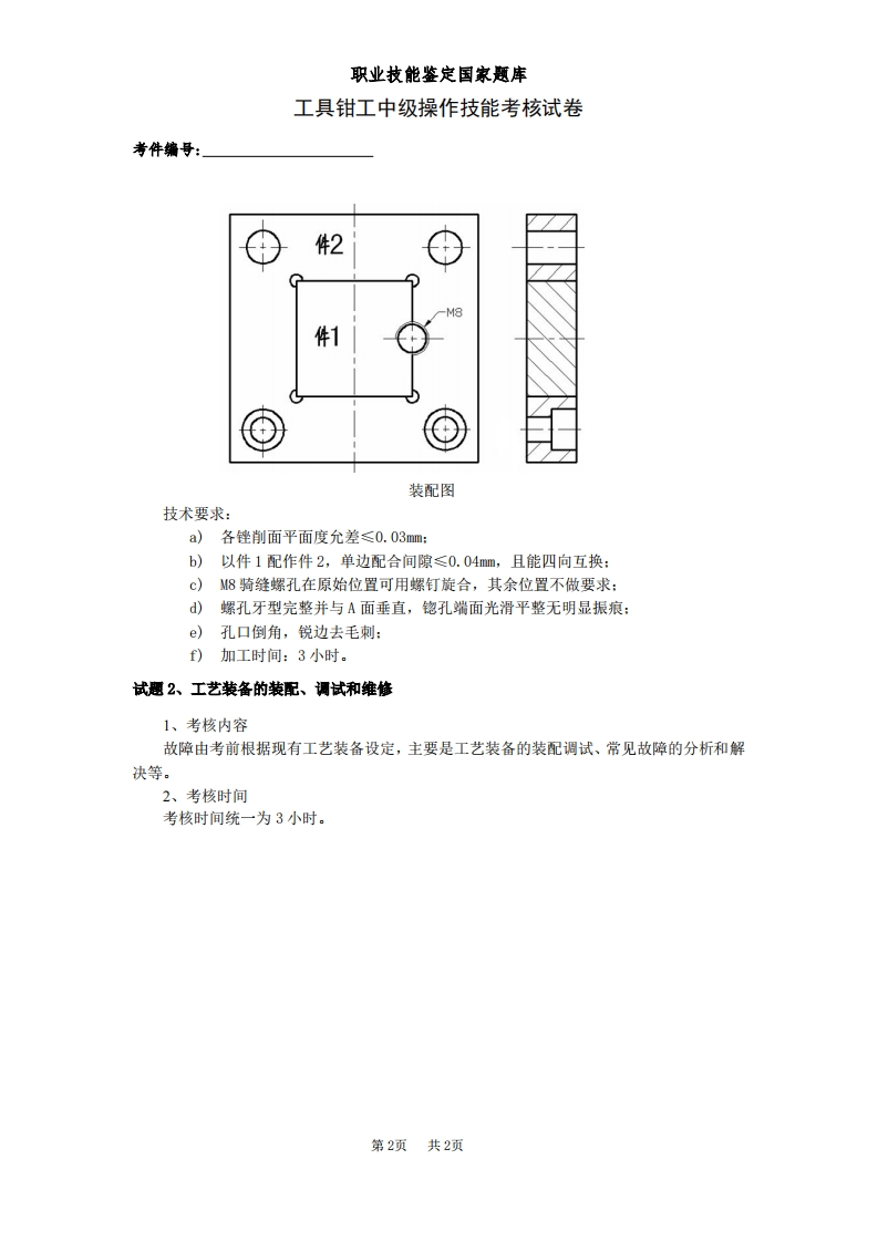 工具钳工中级操作技能考核试卷348072@abc2个月前发布关注私信0.19MB2页04813工具钳工中级操作技能考核试卷此内容为付费资源,请付费后查看¥11¥31黄金会员免费钻石会员免费立即购买您当前未登录!建议登陆后购买,可保存购买订单付费资源 第1页 / 共2页 第2页 / 共2页 已完成全部阅读,共2页 © 版权声明文章版权归作者所有,未经允许请勿转载。THE END初中教育学习资源小学教育教育学类高中教育高考真题 文本预览 职业技能鉴定国家意库工具钳工中级操作技能考核试卷考件编号:谗注意享项一、本试卷依据2008年颁布的《工具钳工》国家职业标准命制。二、请根据试题考核要求,完成考试内容。三、请服从考评人员指挥,保证考核安全顺利进行。试题1、工艺装备零件的加工根据下图的要求进行零件的加工:其余号品件22-08H7/0.03B数L■0.03ACM8(配作】/0.03□001☐0.03AB28(配)44±0.06120+8好8±0.0660巢M8(配作)件10.03AHO28±0.020.03AC12零件图第1页共2页 查看更多 收起部分 喜欢就支持一下吧点赞13 分享QQ空间微博QQ好友海报分享复制链接收藏