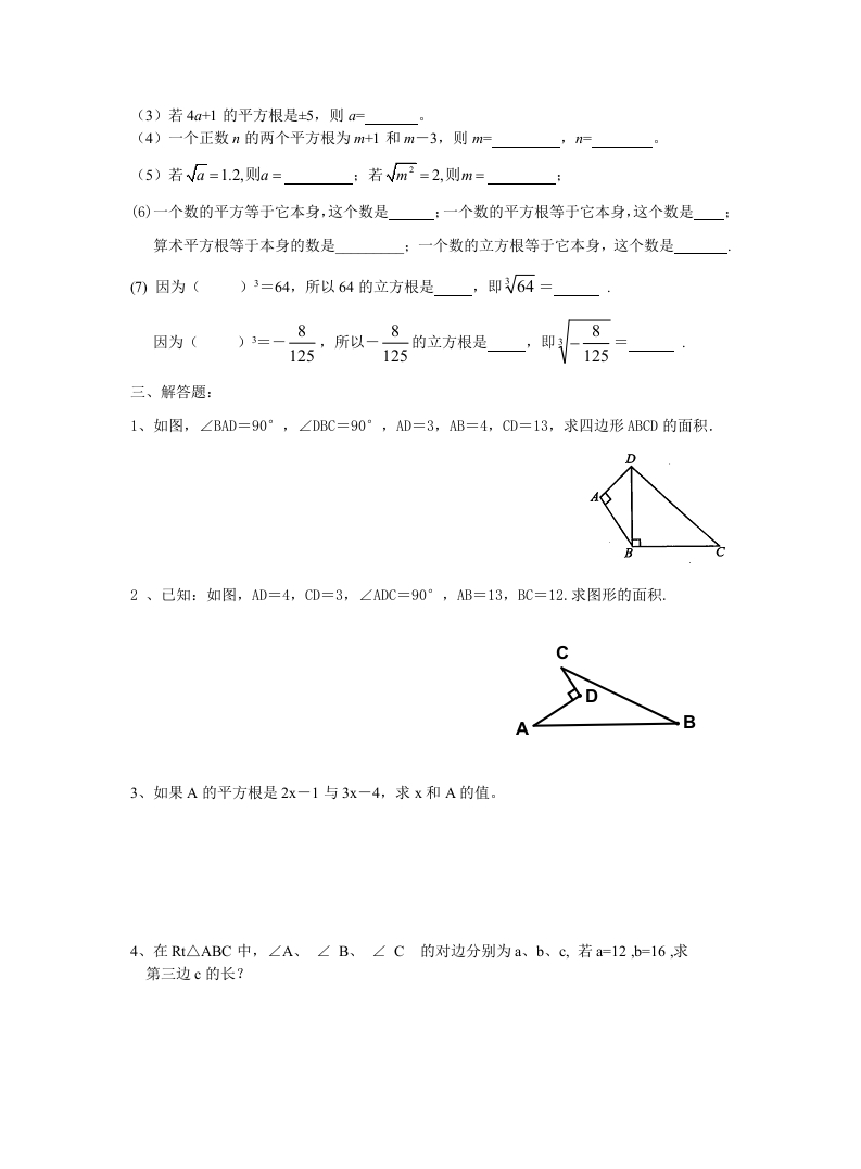 勾股定理、平方根、立方根自学案1、勾股定理:2、神秘的数组(勾股定理的逆定理):满足a+b=c的三个正整数a、b、c叫做勾股数如果三角形的三边长a、b、c满足那么这个三角形是3、如果等于a,那么这个数叫做的a也称为二次方根。4、一个正数a的平方根,记作平方根的性质:5、正数a有两个平方根,其中叫a的算术平方根,6、如果一个数的立方等于a,那么这个数就叫做a的也称为三次方根.即如果x3=a,那么x就叫做a的记为读作“三次根号a”.立方根的性质:例如:因为(±4)2=16,所以±4是16的平方根,也可以说16的平方根是±4,可以表示为±√16=±4。其中,4是16的算术平方根,即√16=49的平方根是±3,5的平方根是±√5,【±√5}=5】,7的算术平方根是√万.因为23=8,所以2是8的立方根。也可以说8的立方根是2,可以表示为V8=227的立方根是3,即√27=3,-64的立方根是-4,即-64=4,10的立方根是10一、选择题:1、下列语句正确的是(A、9的平方根是一3B、7是一49的平方根C、5的平方根是√5D、7的平方根是±√万2、下列说法错误的是(A、9的算术平方根是3B、2是8的立方根C、7的平方根是±√万D、7的立方根是±万二、填空题:(1)16的平方根是25的平方根是100的平方根是3的平方根是5的平方根是(←2)2的平方根是√81的平方根是(2)±V36=:0.01=:(W5j=:16}=