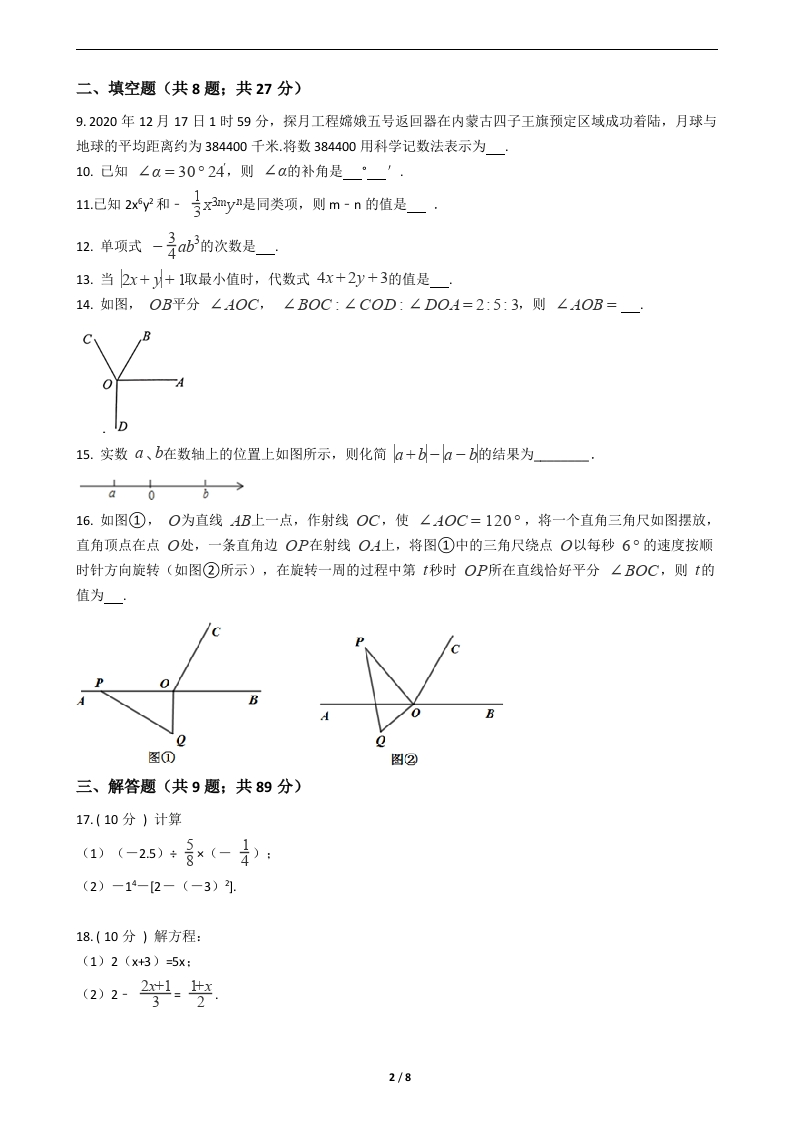 2021-2022学年度第一学期期末自主检测卷A七年级数学(考试时间:90分钟,总分:140分)》一、单选题(共8题:共24分)1.-3的倒数是()A.3c-3D.-32.下列各式中,运算正确的是()A.a+b=abB.3a2+2a2=5a4c.6a-5a=1D.3ab2-4b"a=-ab23.下列正方体的展开图上每个面上都有一个汉字.其中,手的对面是口的是()勤洗勤4勤洗手勤洗手戴D.戴口罩B.洗手戴口手戴口罩罩4.无论x取何值,下列式子的值一定是正数的是()A.B.x2c.K+1D.x2+15.若x=5是关于×的方程2x+3m-1=0的解,则m的值为)A.-3B.-2C.-1D.06.下列解方程过程中,正确的是()A.将10-2(3x-1)=8x+5去括号,得10-6x+1=8x+5B由-x=3,得x=-号c将3-空-号去分母,得3-35x-0=20+2)0由斋+018=1,得9+70-107.如图,己知线段AB=12cm,点N在AB上,NB=2cm,M是AB中点,那么线段MN的长为AN BA.5cmB.4 cmC.3 cmD.2 cm8.若2012个数1、2、、2021满足下列条件:a1=2,a2=-a1+6,a3=-a2+,,a2021=-a2020+6,则2021的值为()A.2B.-2C.-4D.-81/8