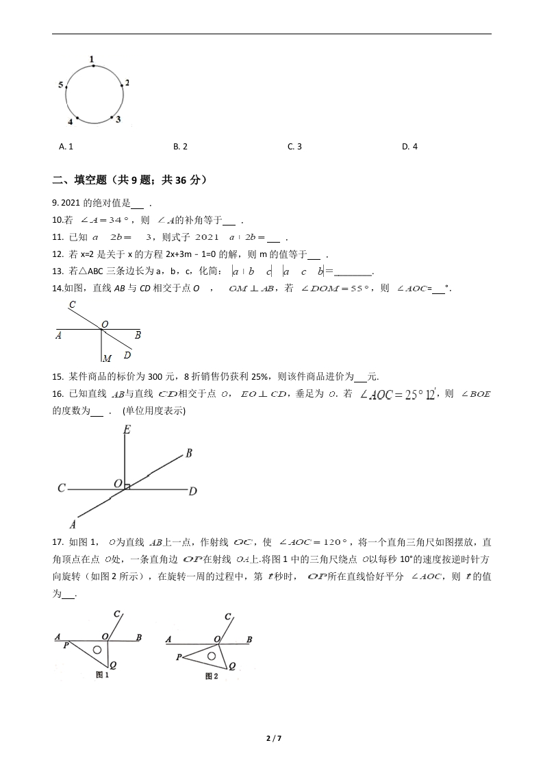 2021-2022学年度第一学期期末自主检测卷B七年级数学(考试时间:90分钟,总分:140分)一、单选题(共8题:共24分)1.-3的相反数是()A.3B.-3c2.下列各式中,正确的是()A.2a Ib=2abB.2x213x2=5x1C.3x4)=3x4D.2b12a2b=a2b3.若有理数a、b在数轴上的位置如图所示,则下列各式中不成立的是()60A.a>-bB.b-abD.a+b<04.下列运算正确的是()A.3x1)=3x1B.3x1)=3x11C.3x1)=3x3D.{x1)=3x135.下列每组数分别是三根小木棒的长度,不能用它们搭成三角形的是()A.1cm,2cm,3cm B.2cm,3cm,4cm C.3cm,4cm,5cm D.5cm,6cm,7cm6.如图是一副三角板摆成的图形,如果∠AOB=160°,那么∠COD等于()BA.15B.20°C.30°D.407.已知在数轴上,点A表示的数为1,点B表示的数为,点O表示的数为0,且为<0<2,x=x则()A.AO+AB=2B0B.BO=ABC.2AO十÷B0=ABD.BO=AB8.如图是一个圆,一只电子跳蚤在标有数字的五个点上跳跃.若它停在奇数点上时,则下一次沿顺时针方向跳两个点:若停在偶数点上时,则下一次沿逆时针方向跳一个点,若这只跳蚤从这点开始跳,则经过2021次跳跃后它所停在的点对应的数为()1/7