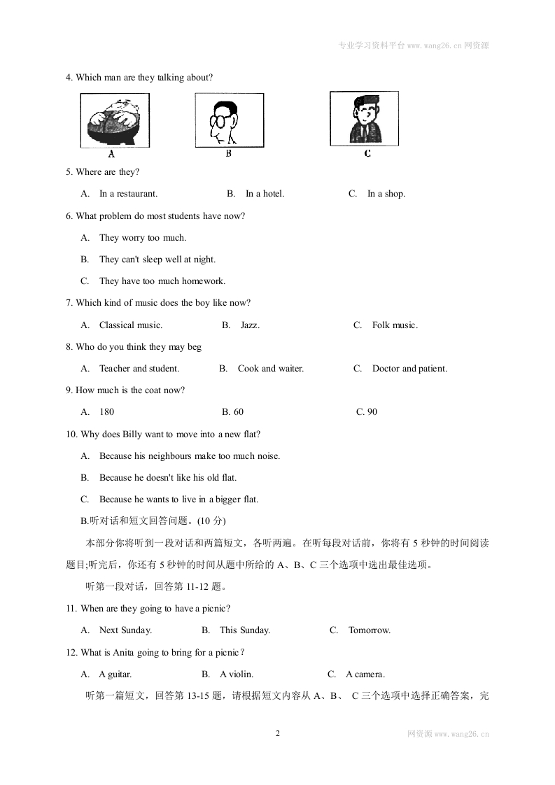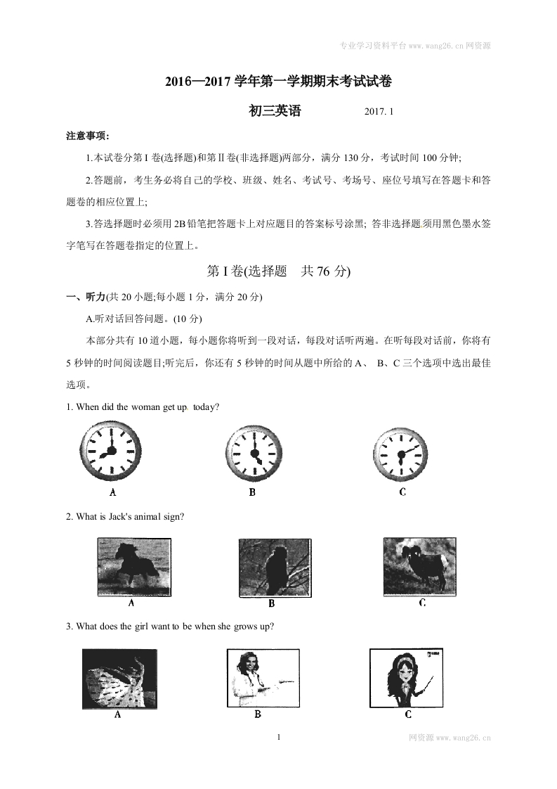专业学习资料平台m.mang26.cn网资源2016一2017学年第一学期期末考试试卷初三英语2017.1注意事项:1.本试卷分第I卷(选择题)和第Ⅱ卷(非选择题)两部分,满分130分,考试时间100分钟:2.答题前,考生务必将自己的学校、班级、姓名、考试号、考场号、座位号填写在答题卡和答题卷的相应位置上;3.答选择题时必须用2B铅笔把答题卡上对应题目的答案标号涂黑;答非选择题须用黑色墨水签字笔写在答题卷指定的位置上。第I卷(选择题共76分)一、听力(共20小题:每小题1分,满分20分)A.听对话回答问题。(10分)本部分共有10道小题,每小题你将听到一段对话,每段对话听两遍。在听每段对话前,你将有5秒钟的时间阅读题目:听完后,你还有5秒钟的时间从题中所给的A、B、C三个选项中选出最佳选项。1.When did the woman get up.today?B2.What is Jack's animal sign?A3.What does the girl want to be when she grows up?B网资源mmm.Wang26.cn
