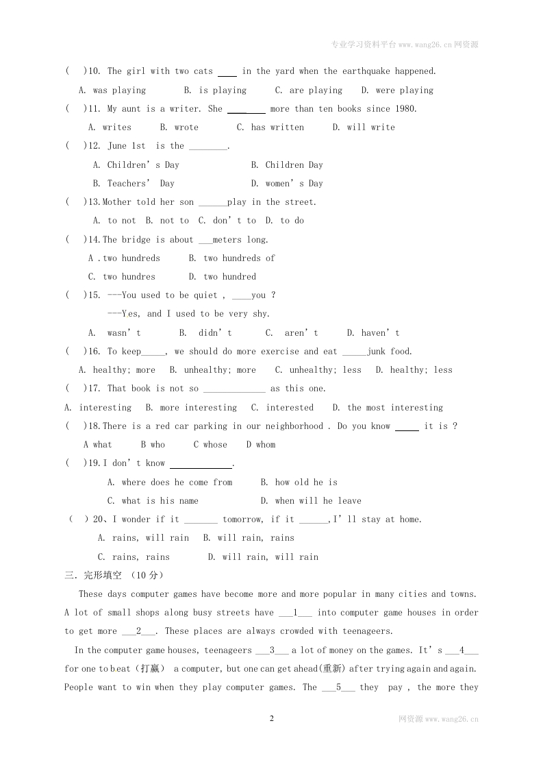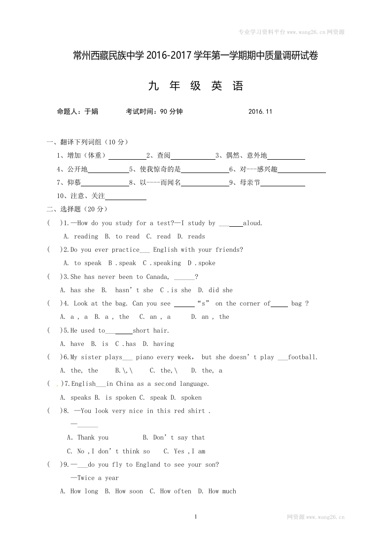 专业学习资料平台m.ang26.cn网资源常州西藏民族中学2016-2017学年第一学期期中质量调研试卷九年级英语命题人:于娟考试时间:90分钟2016.11一、翻译下列词组(10分)》1、增加(体重)2、查阅3、偶然、意外地4、公开地5、使我惊奇的是6、对一感兴趣7、仰慕8、以一而闻名9、母亲节10、注意、关注二、选择题(20分)()1.-How do you study for a test?-I study byaloud.A.reading B.to read C.read D.reads()2.Do you ever practice English with your friends?A.to speak B.speak C.speaking D.spoke()3.She has never been to Canada,A.has she B.hasn't she C.is she D.did she()4.Look at the bag..Can you see“s”on the corner of bag?A.a,a B.a,the C.an,a D.an,the()5.He used to_short hair.A.have B.is C.has D.having()6.My sister playspiano every week,but she doesn't playfootball.A.the,the B.,C.the,D.the,a)7.English_in China as a second language.A.speaks B.is spoken C.speak D.spoken()8.-You look very nice in this red shirtA.Thank youB.Don't say thatC.No,I don't think so C.Yes,I am()9.-do you fly to England to see your son?-Twice a yearA.How long B.How soon C.How often D.How much网资源mmm.Wang26.cn