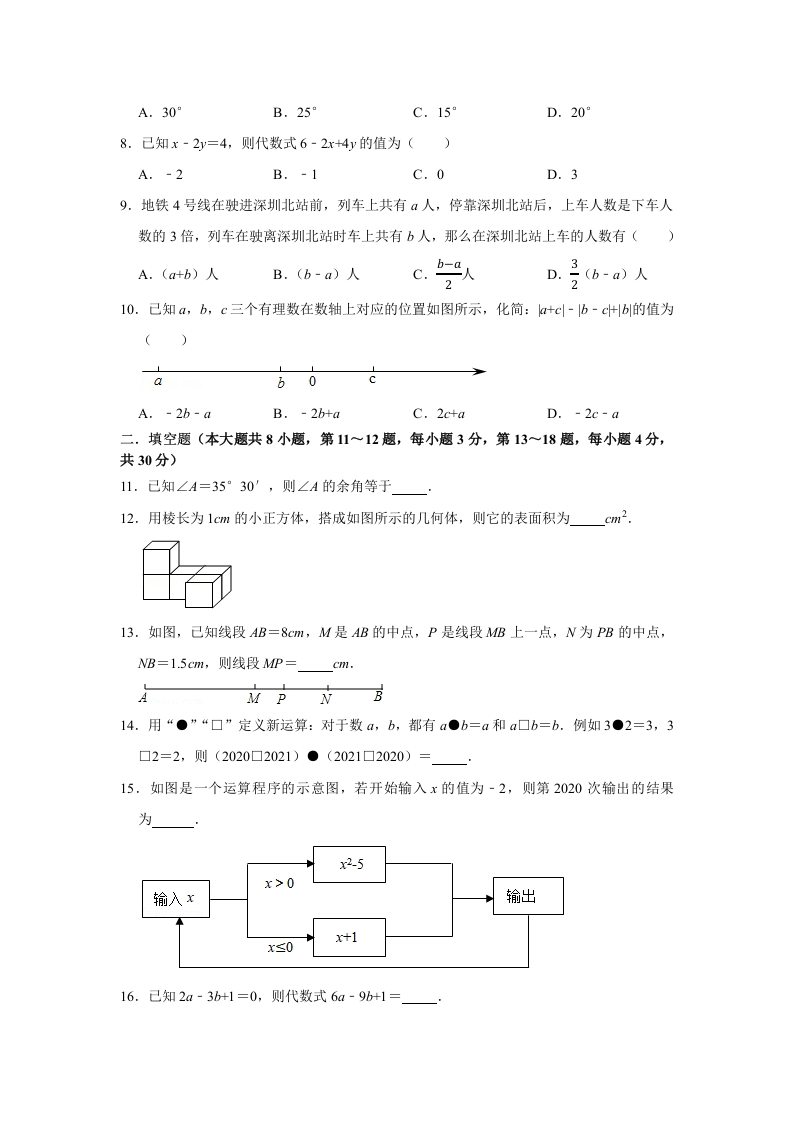 2021-2022学年江苏省海安市紫石中学七年级(上)期末数学模拟试卷(2)一、选择题(本题共有10小题,每小题3分,共30分,每小题有四个选项,其中只有一个是正确的)1.下列各数中,最小的一个数是()A.-3B.-1C.0D.22.如图,数轴上蚂蚁所在点表示的数可能为()0A.3B.0C.-1D.-23.嫦娥五号(Change5)是中国探月工程三期发射的月球探测器,为中国首个实施无人月面取样返回的探测器,由中国空间技术研究院研制,于2020年11月24日成功发射,嫦娥五号质量8200千克,将8200千克用科学记数法表示为()克.A.0.82×107B.82×10C.8.2×10D.8.2×1034.如图,正方体表面展开平面图中六个面分别标注有“战、胜、新、冠、病、毒”六个中文,在原正方体中,“战”的对面是()战新冠病毒胜A.毒B.新C.胜D.冠5.若-2ym+y4=-xy4,那么m+n的值是()A.4B.5C.6D.不能确定6.下列说法中,正确的是()A.多项式x2+2+18是二次三项式B.多项式3x2+22-5的项是3x2、22、51C.21是单项式D.多项式x2+y2-1的常数项是17.钟面上3点20分时,时针与分针的夹角度数是()