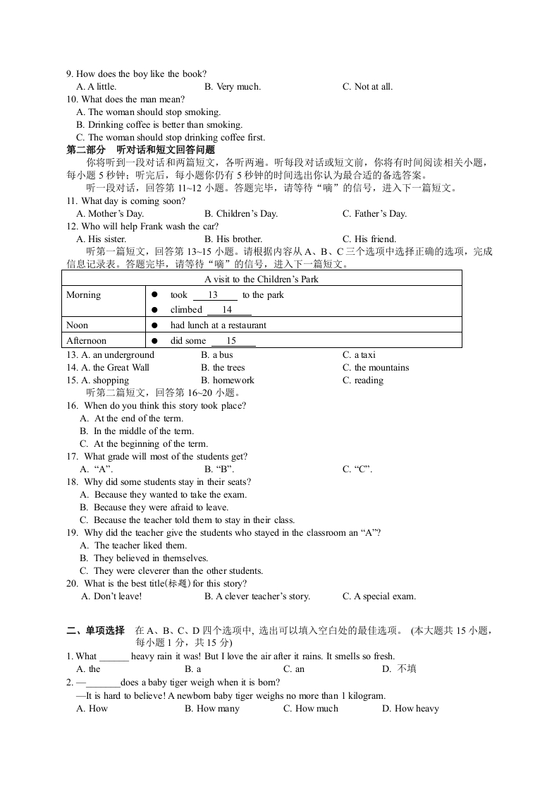 2016-2017学年第一学期八年级英语期末试卷2017.01注意事项:1.本试题分两卷。考试时间为100分钟。试卷满分为100分。2.所有答案必须写在答题卷各题目指定区域内相应的位置上。答案写在试卷其他部分无效。第1卷客观题(共5分)一、听力部分(本大题共20小题,每小题1分,共20分)》第一部分听对话回答问题本部分共有10道小题,每小题你将听到一段对话,每段对话听两遍。在听每段对话前,你将有5秒钟的时间阅读题目:听完后,你仍有5秒钟的时间选出你认为最合适的备选答案。请在听到“嘀”的信号后,进入下一小题。1.What does John's mother like to do?B2.What animal does the boy want to keep?AB3.What time is it now?1121022E 84.3ABuu4.What's the girl looking for?A.5.Why didn't the man catch the train?A.The traffic was too heavy.B.He lost his way to the station.C.He didn't start out early enough.6.How may the woman go to the Forest Park?A.By bike.B.By bus.C.By taxi.7.What is the boy doing?A.Parking his car.B.Taking photos.C.Playing football.8.What will the weather be like tomorrow?A.Sunny.B.RainyC.Cloudy.