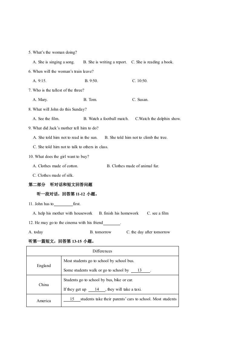 靖江市靖城中学2016-2017学年第一学期期中考试八年级英语试卷(考试时问:120分钟满分:150分)一、听力测试(20分)第一部分听对话回答问题1.What animals are they talking about?2.Which sport does the boy like best?A.B.CPA裙6通3.How does the boy's father go to work?B4.Which city does Kate like to go to?BC