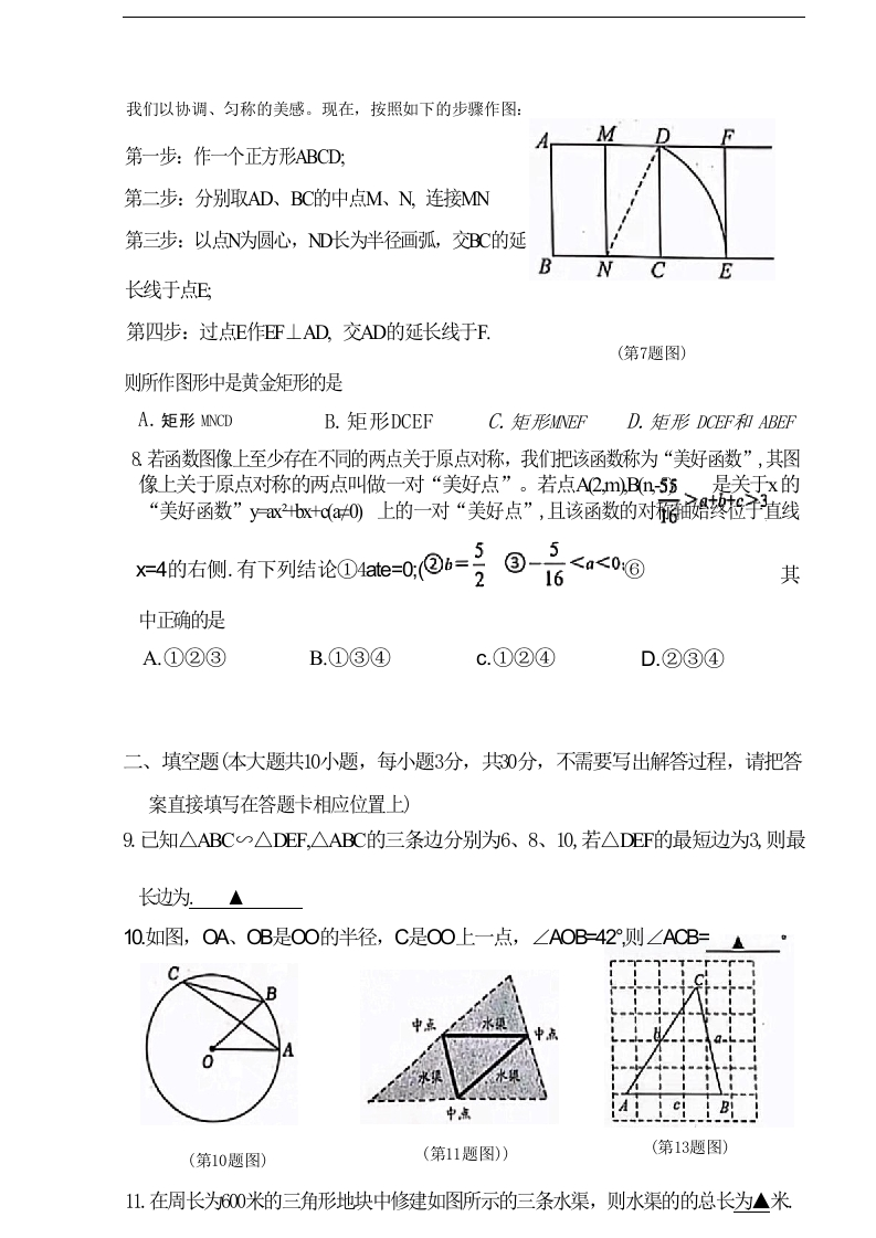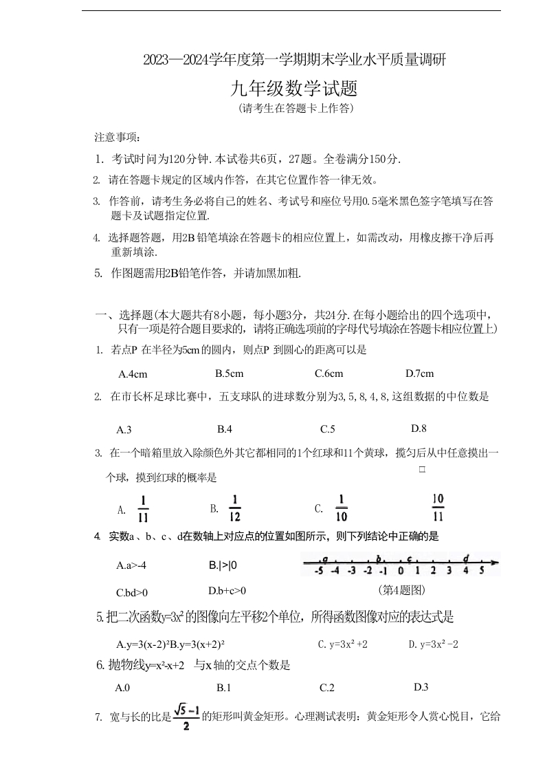 2023一2024学年度第一学期期末学业水平质量调研九年级数学试题(请考生在答题卡上作答)注意事项:1.考试时问为120分钟.本试卷共6页,27题。全卷满分150分2.请在答题卡规定的区域内作答,在其它位置作答一律无效。3.作答前,请考生务必将自己的姓名、考试号和座位号用0.5毫米黑色签字笔填写在答题卡及试题指定位置,4.选择题答题,用2B铅笔填涂在答题卡的相应位置上,如需改动,用橡皮擦干净后再重新填涂。5.作图题需用2B铅笔作答,并请加黑加粗.,一、选择题(本大题共有8小题,每小题3分,共24分.在每小题给出的四个选项中,只有一项是符合题目要求的,请将正确选项前的字母代号填涂在答题卡相应位置上)1.若点P在半径为5cm的圆内,则点P到圆心的距离可以是A.4cmB.5cmC.6cmD.7cm2.在市长杯足球比赛中,五支球队的进球数分别为3,5,8,4,8,这组数据的中位数是A.3B.4c.5D.83.在一个暗箱里放入除颜色外其它都相同的1个红球和11个黄球,揽匀后从中任意摸出一个球,摸到红球的概率是◇A.B.C.1110品4实数a、b、c、d在数轴上对应点的位置如图所示,则下列结论中正确的是B.>l0bg1A.a>.45432012345C.bd-0D.b+c>0(第4题图)5.把二次函数y3x的图像向左平移2个单位,所得函数图像对应的表达式是A.y=3(x-2)2B.y=3(x+2)2C.y=3x2+2D.y=3x2-26.抛物线yx2x+2与x轴的交点个数是A.0B.1C.2D.3?.宽与长的比是5一的矩形叫黄金矩形。心理测试表明:黄金矩形令人赏心悦日,它给2