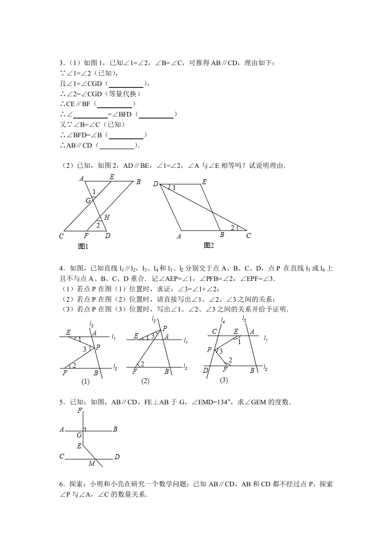 2015-2016学年江苏省连云港市赣榆实验中学七年级(上)月考数学试卷(10月份)一.解答题(共30小题)1.如图,己知直线m∥n,直线m,n和直线AB分别交于A、B两点,直线m,n和直线CD分别交于C、D两点.点P在直线AB上.∠1是线段CP与CA的夹角,∠2是线段DP与DB的夹角,∠3是线段PC与PD的夹角.(1)如图点P在线段AB上,且不与A,B两点重合.试找出∠1、∠2、∠3之间的关系式,并证明.(2)如果点P运动到直线m上方时,请画出图形,找出∠1、∠2、∠3之间的关系式,并证明.(3)如果点P运动到直线下方时,请画出图形,找出∠1、∠2、∠3之间的关系式,不用证明。2.如图,AB∥CD,AE平分∠BAC,CE平分∠ACD,求∠E为多少?下面是小明同学的解法,请帮助他完成证明。证明:因为∠1=∠ECD专∠ACD(原因又因为∠2=(∠BAE)号CAB(原因:又因为AB∥CD所以∠CAB+∠ACD-180°(原因:所以∠1+∠2-号(∠CAB+∠ACD)-90°(等量代换)又因为∠1+∠2+∠E=180°(原因:所以∠E=90°.AD