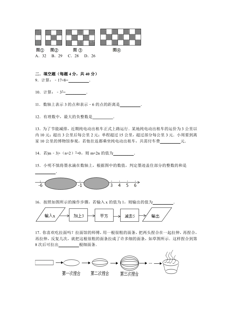 2015-2016学年江苏省连云港市灌云县西片七年级(上)第一次月考数学试卷一,选择题(每题4分,共32分)1.如图,在数轴上点M表示的数可能是()4321012>A.1.5B.-1.5C.-2.4D.2.42。-的倒数是(A2B2C是D.-3.中国航空母舰“辽宁号”的满载排水量为67500吨.将数67500用科学记数法表示为()A.0.675×10B.6.75×104C.67.5×103D.675×1024.如图,检测4个足球,其中超过标准质量的克数记为正数,不足标准质量的克数记为负数.从轻重的角度看,最接近标准的是(-3.5+2.5-0.6+0.75.桂林冬季里某一天最高气温是7℃,最低气温是-1℃,这一天桂林的温差是(A.-8℃B.6℃C.7℃D.8℃6.定义运算a⑧b=a(1-b),下面给出的关于这种运算的四个结论中正确的是(A.2⑧(-2)=-4B.a⑧b-b⑧aC.(-2)⑧2=2D.若a⑧b0,则a=07.己知a上5,b=2,且ab<0,则ab的值是(A.10B.-10C.10或-10D.-3或-78.下列图形都是由几个黑色和白色的正方形按一定规律组成,图①中有2个黑色正方形,图②中有5个黑色正方形,图③中有8个黑色正方形,图④中有11个黑色正方形,,依次规律,图©中黑色正方形的个数是()