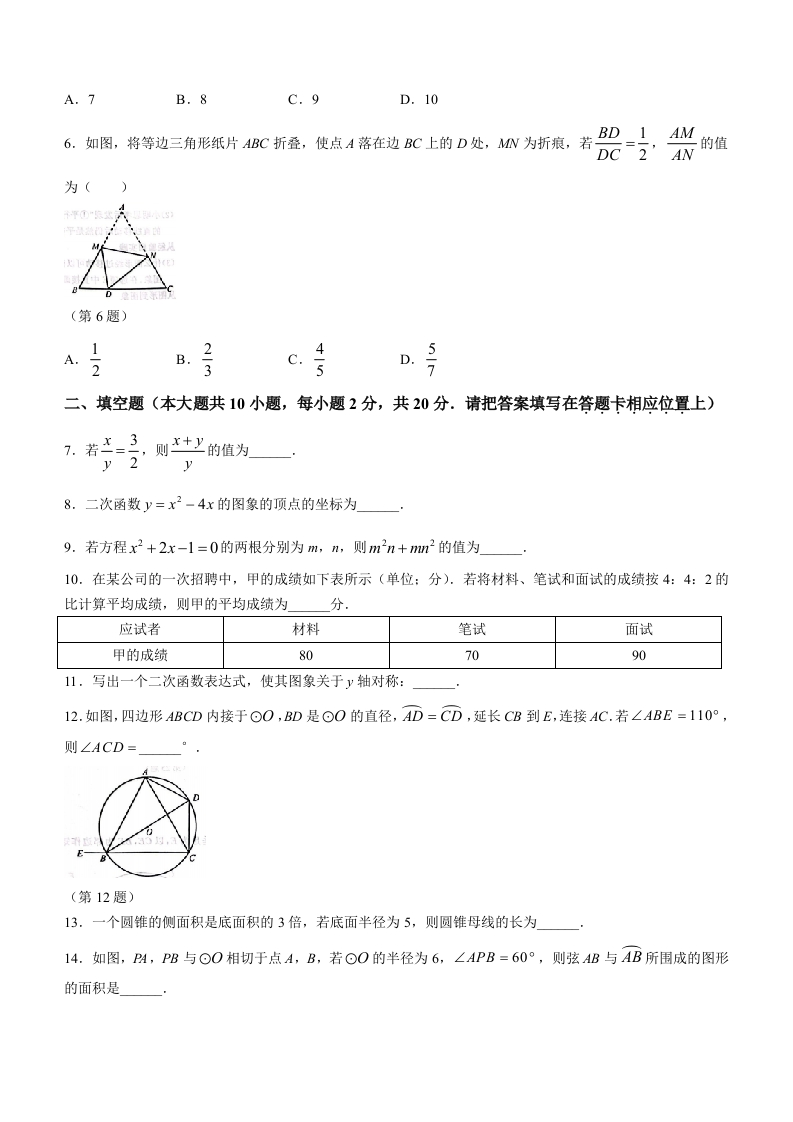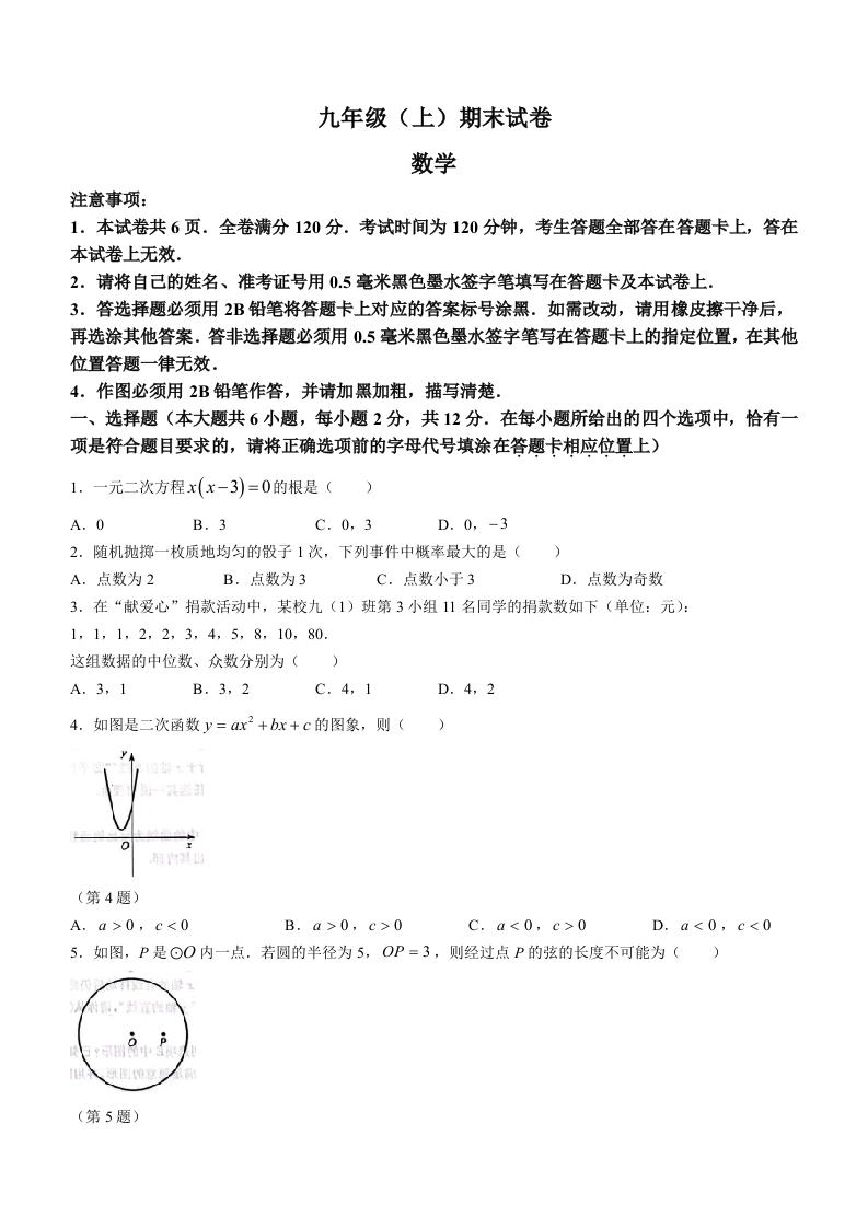 九年级(上)期末试卷数学注意事项:1.本试卷共6页.全卷满分120分.考试时间为120分钟,考生答题全部答在答题卡上,答在本试卷上无效。2.请将自己的姓名、准考证号用0.5毫米黑色墨水签字笔填写在答题卡及本试卷上.3.答选择题必须用2B铅笔将答题卡上对应的答案标号涂黑。如需改动,请用橡皮擦干净后,再选涂其他答案.答非选择题必须用0.5毫米黑色墨水签字笔写在答题卡上的指定位置,在其他位置答题一律无效.4.作图必须用2B铅笔作答,并请加黑加粗,描写清楚一、选择题(本大题共6小题,每小题2分,共12分.在每小题所给出的四个选项中,恰有一项是符合题目要求的,请将正确选项前的字母代号填涂在答题卡相应位置上)1.一元二次方程x(x-3)=0的根是()A.0B.3C.0,3D.0,-32.随机抛掷一枚质地均匀的骰子1次,下列事件中概率最大的是()A.点数为2B.点数为3C.点数小于3D.点数为奇数3.在“献爱心”捐款活动中,某校九(1)班第3小组11名同学的捐款数如下(单位:元):1,1,1,2,2,3,4,5,8,10,80.这组数据的中位数、众数分别为()A.3,1B.3,2C.4,1D.4,24.如图是二次函数y=ax2+bx+c的图象,则()特(第4题)A.a>0,c<0B.a>0,c>0C.a<0,c>0D.a<0,c<05.如图,P是⊙O内一点.若圆的半径为5,OP=3,则经过点P的弦的长度不可能为()飞(第5题)