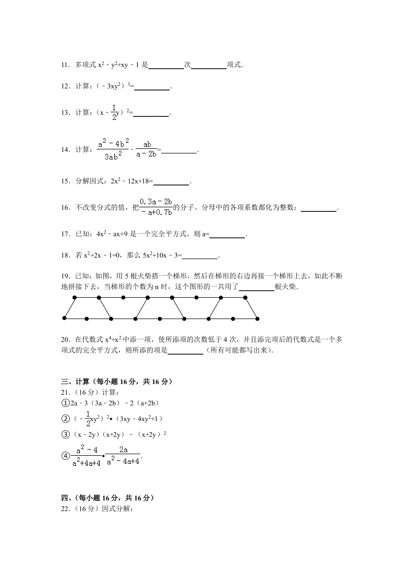 2015-2016学年江苏省南京市雨花区梅山二中七年级(上)第二次月考数学试卷一、选择题(每小题2分,共12分)1.下列各式3,at地'7,2,5,x-13六9义中,分式有()个A.1个B.2个C.3个D.4个2.下列运算中,计算结果正确的是()A.a2+a3-a5B.3(a-1)=3a-1C.(3a3)2-9a6D.(a+b)2-a2+b23.下列各式从左到右的变形是正确的因式分解的是()A.3x3-2xy+x=x(3x2-2y)B.(x+y)(x-y)x2-y2C.a2-28=(a+5)(a-5)-3D.x2+4x+4(x+2)24.下列各式中,不能用平方差公式的是()A.(4x-3y)(3y-4x)B.(-4x+3y)(4x+3y)C.(-4x+3y)(-4x-3y)D.(4x+3y)(4x-3y)5.如(2x+m)与(x-3)的乘积中不含x的一次项,则m的值为()A.-3B.3C.-6D.66,如果把分式设一中的x和y都扩大3倍,那么分式的值()A.扩大3倍B.不变C.缩小3倍D.缩小6倍二、填空题(每小题2分,共28分)7.单项式1xy的系数;次数为68.已知:y与3xy是同类项,则9.把多项式5y4-x4+3x2y-y2-5xy按字母y降幂排列为10.分式23当时分式的值为零.x-3