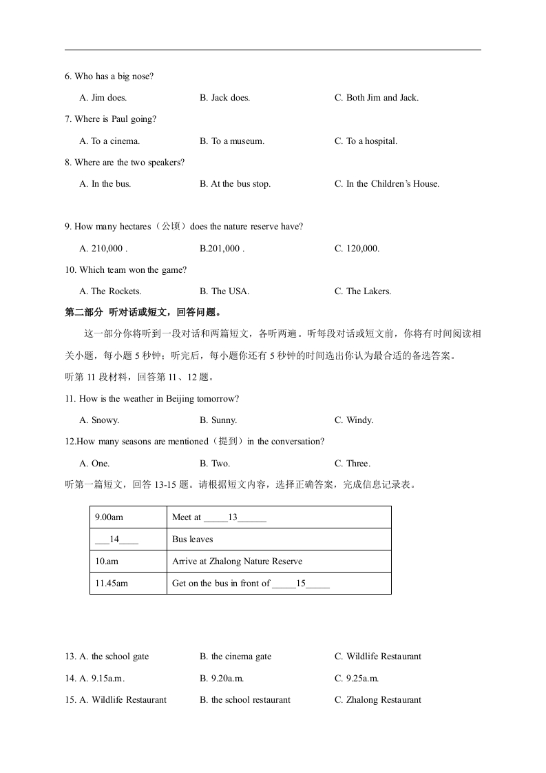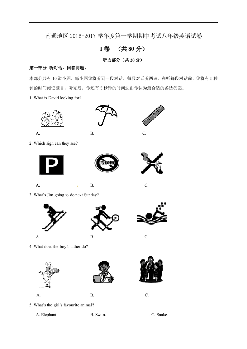 南通地区2016-2017学年度第一学期期中考试八年级英语试卷I卷(共80分)听力部分(共20分)第一部分听对话,回答问题。本部分共有10道小题,每小题你将听到一段对话,每段对话听两遍。在听每段对话前,你将有5秒钟的时间阅读题目:听完后,你还有5秒钟的时间选出你认为最合适的备选答案。1.What is David looking for?A2.Which sign can they see?●危喉物XA.B3.What's Jim going to do next Sunday?多&4.What does the boy's father do?B.5.What's the girl's favourite animal?A.ElephantB.Swan.C.Snake