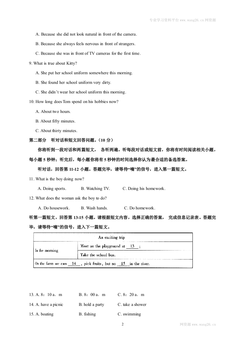 专业学习资料平台m.mang26.cn网资源2016一2017学年度第一学期期中学业水平测试九年级英语试卷(本卷满分140分考试时间120分钟)第I卷(选择题,80分)一、听力(共20小题:每小题1分,满分20分)A)根据所听的对话选择合适的图片和答案,每个对话读两遍。1.What is Jack's animal sign?AB2.In which country did Emma enjoy her holiday?A.3.What does John do?AB4.Where docs the woman want to go?A.95.What does the man want the woman to do?A.Go awayB.Drive a carC.Help her6.Who's answering the phone?A.Windy.B.JennyC.Steve.7.Is it possible for the man to borrow the storybook from the woman now?A.Yes,it is.B.No,it isn't.C.We don't know.8.Why did Yang Li look nervous just now?网资源mm.Wang26.cn