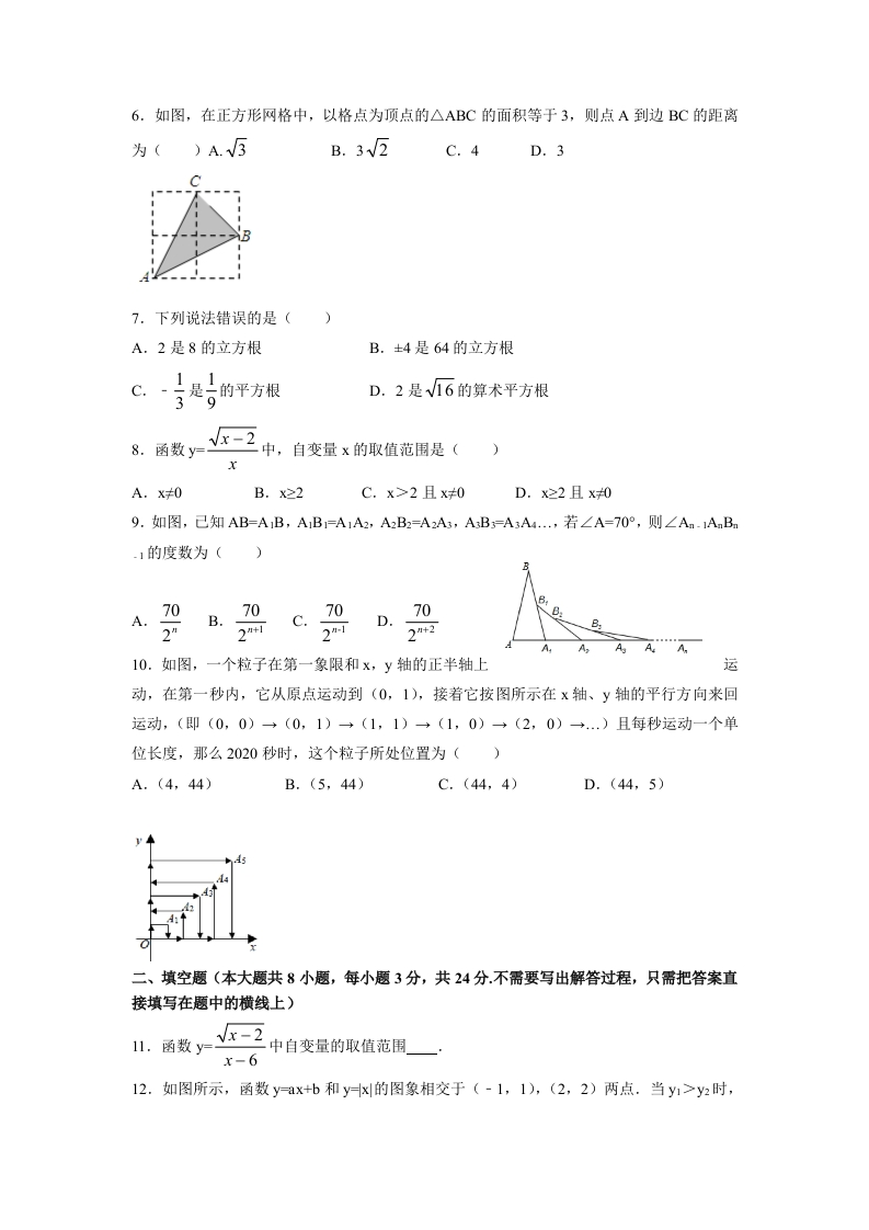 苏州市2022-2023学年初二上学期期末提优卷数学(本试卷满分130分,考试时间:120分钟)姓名:学校:得分一、选择题(本大题共有10小题,共30分)1.如图,点D,E分别在线段AB,AC上,CD与BE相交于O点,己知AB=AC,现添加以下的哪个条件仍不能判定△ABE≌△ACD()A.∠B=∠CB.AD-AEC.BD-CED.BE-CD2.下面四个手机应用图标中是轴对称图形的是()D3.如图,矩形纸片ABCD中,AB-4,BC=8,将纸片沿EF折叠,使点C与点A重合,则下列结论错误的是(A.AF-AEB.△ABE≌△AGFC.AF=EFD.EF=2√5GD4.如图,在4×4方格中作以AB为一边的Rt△ABC,要求点C也在格点上,这样的Rt△ABC能作出()A.2个B.6个C.4个D.3个B5.△ABC中,AB=AC-5,BC-8,点P是BC边上的动点,过点P作PD⊥AB于点D,PE⊥AC于点E,则PD+PE的长是()A.4.8B.4.8或3.8C.3.8D.5