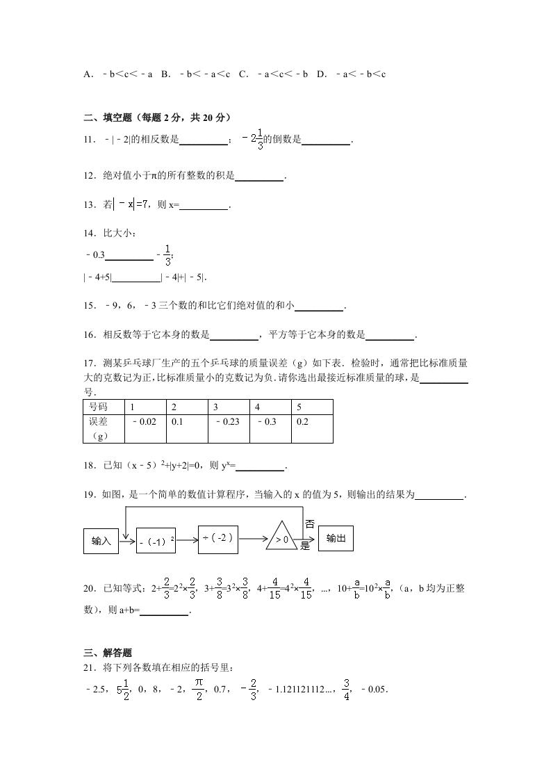 2015-2016学年江苏省苏州市常熟市七年级(上)月考数学试卷(10月份)一、选择题(每题2分,共20分)1.绝对值为5的有理数是()A.2.5B.t5C.5D.-52.平方得16的数是()A.4B.-4C.4D.±163.据统计,2013年河南省旅游业总收入达到约3875.5亿元.若将3875.5亿用科学记数法表示为3.8755×109,则n等于()A.10B.11C.12D.134.下列运算正确的是()A.-24(-2)21B.(-22)3=-81327c-5÷×号-25D.3时×(-325)-6x3.25-32.55.已知a>0,b<0,且a+b>0,下列说法错误的是()A.a-b>0 B.a-b6.下列说法正确的是()①非负数与它的绝对值的差为0②相反数大于本身的数是负数③数轴上原点两侧的数互为相反数④两个数比较,绝对值大的反而小.A.①②B.①③C.①②③D.①②③④7.设a为最小的正整数,b是最大的负整数,c是绝对值最小的数,d是倒数等于自身的有理数,则a-b+c-d的值为()A.1B.3C.1或3D.2或-18.a为有理数,下列判断正确的是()A.-a一定是负数B.a一定是正数C.a一定不是负数D.-a一定是负数9.计算(-0.25)2007×(-4)2008等于()A.-1B.1C.-4D.410.若有理数a、b、c在数轴上的位置如图所示,则将-a、-b、c按从小到大的顺序为()c a 0