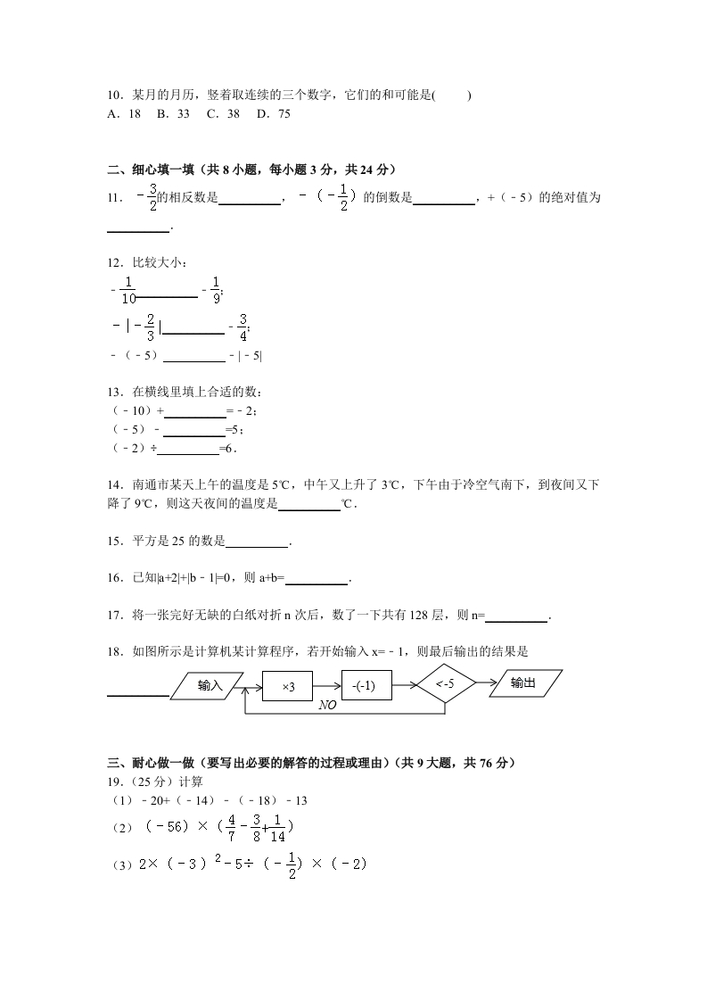 2015-2016学年江苏省苏州市常熟市国际学校七年级(上)第一次月考数学试卷一、精心选一选(本题共10小题,每题3分,满分30分)1.如果收入200元记作+200元,那么支出150元记作()A.+150元B.-150元C.+50元D.-50元2.-2的倒数是(A2B2C是D.13.在数轴上与-3的距离等于4的点表示的数是()A.1B.-7C.1或-7D.无数个4.用科学记数法表示602300,应该是()A.602.3×103B.6023×102C.6.023×105D.6.023×1055.下列各组数中,互为相反数的是()A2与号B.(-1)2与1C.-1与(-1)3D.-(-2)与-|-26.在(-1)5,(-1)10,-23,(-3)2这四个数中,最大的数比最小的数要大()A.17B.10C.8D.57.下列说法正确的是()①0是绝对值最小的有理数②相反数大于本身的数是负数③数轴上原点两侧的数互为相反数④两个数比较,绝对值大的反而小。A.①②B.①③C.①②③D.①②③④8.下列运算正确的是()A.-5+2=-(9t3)=-1B.-7-2x5=-9x5=-457T77T71C.3÷5x4F4×53÷1=3D.·(-3)2-99.表示a,b两数的点在数轴上位置如图所示,则下列判断错误的是()bA.a+b<0 B.a-b>0 C.axb>0 D.a