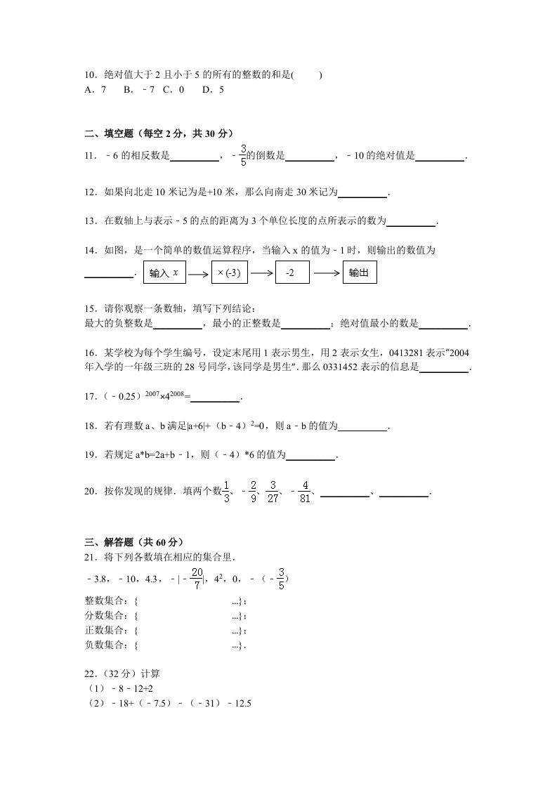 2015-2016学年江苏省苏州市常熟市阳光学校七年级(上)第一次月考数学试卷一、选题(3分×:10=30分,将答案填在下面表格中)1.李白出生于公元701年,我们记作+701,那么秦始皇出生于公元前256年,可记作()A.256B.-957C.-256D.4452.一的相反数是(A.-B.2c是D.23.小明家冰箱冷冻室的温度为-5℃,调低4℃后的温度为()A.4℃B.-9℃C.-1℃D.9℃4.数轴上一点A,一只蚂蚁从A出发爬了4个单位长度到了原点,则点A所表示的数是()A.4B.-4C.±8D.±45.计算-32的结果是()A.9B.-9C.6D.-66.下列式子化简不正确的是()7.有理数a、b在数轴上的位置如图所示,则ab的值()6>A.大于0B.小于0C.等于0D.大于b8.在“神七”遨游太空的过程中,宇航员翟志刚走出舱外漫步太空19分35秒,他和飞船一起飞过了9165000米,由此成为“走“得最快的中国人.将9165000米用科学记数法表示为()米.A.9165×103B.9.165×105C.9.165×105D.0.9165×1079.在我校初一新生的体操训练活动中,共有123名学生参加.假如将这123名学生排成一列,按1、2、3、4、3、2、1、2、3、4、3、2、1…的规律报数,那么最后一名学生所报的数是()A.1B.2C.3D.4