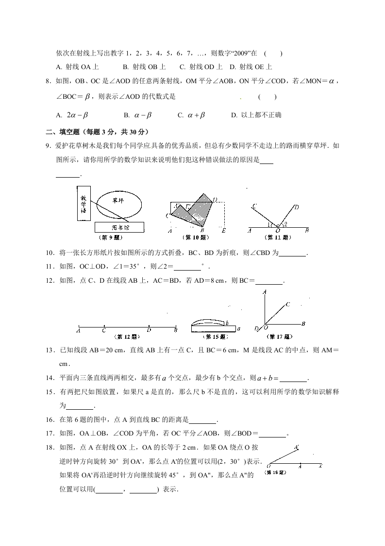 2016.4七年级数学第六章平面图形的认识(一)一、选择题(每题3分,共24分)1.己知∠1=30°,则∠1的余角度数是A.160B.150C.70°D.602.上午7点半时,时针和分针所成的锐角是()A.30B.45C.60D.753.如图,己知直线AB、CD相交于点O,OE平分∠COB,若∠EOB=55°,则∠BOD的度数是()A.35°B.55C.70D.110一东5U9(第不题}《第本显)(第5恶)4.如图,将一副三角板的直角顶点重合放置于A点处(两块三角板看成在同一平面内),下列结论一定成立的是()A.∠BAE>∠DACB.∠BAE+∠DAC=180C.∠BAE-∠DAC=45°.D.∠BAD≠∠EAC5.某测绘装置上一枚指针原来指向南偏西50°(如图),把这枚指针按逆时针方向旋转一周,则结果指针的指向()A.南偏东50B.西偏北50°C.南偏东40°D.东南方向6.如图,AC⊥BC,AD⊥CD,AB=10,CD=8,则AC的长不可能是,()A.9.9B.9C.8.1D.7.9102(弟i题)〔第7题:(第8随)7.如图,平面内有公共端点的六条射线OA、OB、OC、OD、OE、OF,从射线OA开始按逆时针