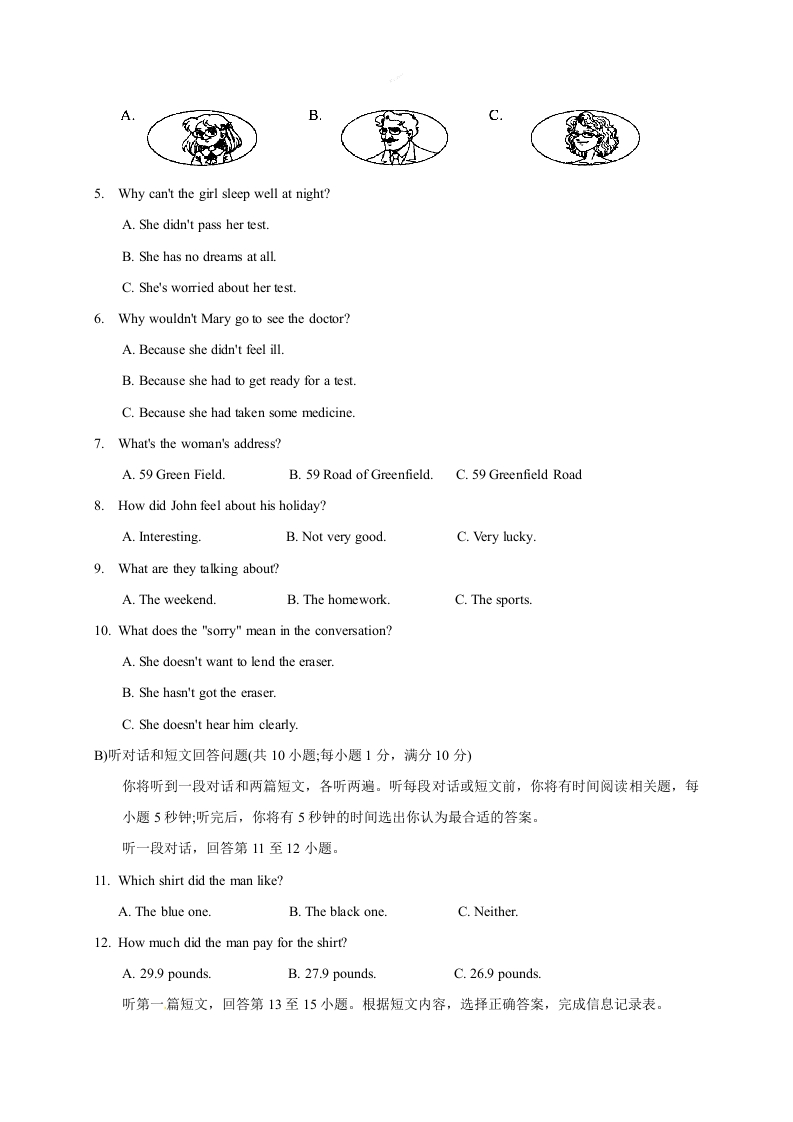2016-2017学年第一学期期末考试试卷八年级英语2017.01本试卷分第I卷(选择题)和第Ⅱ卷(非选择题)两部分。共九大题86小题,满分130分。考试用时100分钟。注意事项:1.答题前,考生务必将学校、班级、姓名、考试号填写在答题卷相应的位置上:将学校、姓名、年级、考场、座号、考试号填写(涂)在答题卡相应的位置上。2.答选择题必须用2B铅笔把答题卡上对应题目的答案标号涂黑:答非选择题必须用0.5mm的黑色墨水签字笔写在答题卷指定的位置上,不在答题区域的答案一律无效,不得用其他笔答题】3.考生答题必须在答题卡和答题卷上,答在试卷上和草稿纸上一律无效。第1卷(四大题,共69分)一、听力选择(共两部分,满分20分)(请先用两分钟时间熟悉听力试题,然后再动笔答题。做题时,请先将答案划在试卷上。录音内容结束后,你将有两分钟的时间将试卷上的答案转涂到答题卷上。)A)听对话回答问题(共10小题:每小题1分,满分10分)本部分共有10道小题,每小题你将听到一段对话,每段对话听两遍。在听每段对话前,你将有5秒钟的时间阅读题目:听完后,你将有5秒钟的时间选出你认为最合适的答案。1.Who could probably be Mr Gao?B.C2.Where did the conversation probably happen?B.0G球5T0E☑上驱山3.What is the film about?B.4.Who are they talking about?